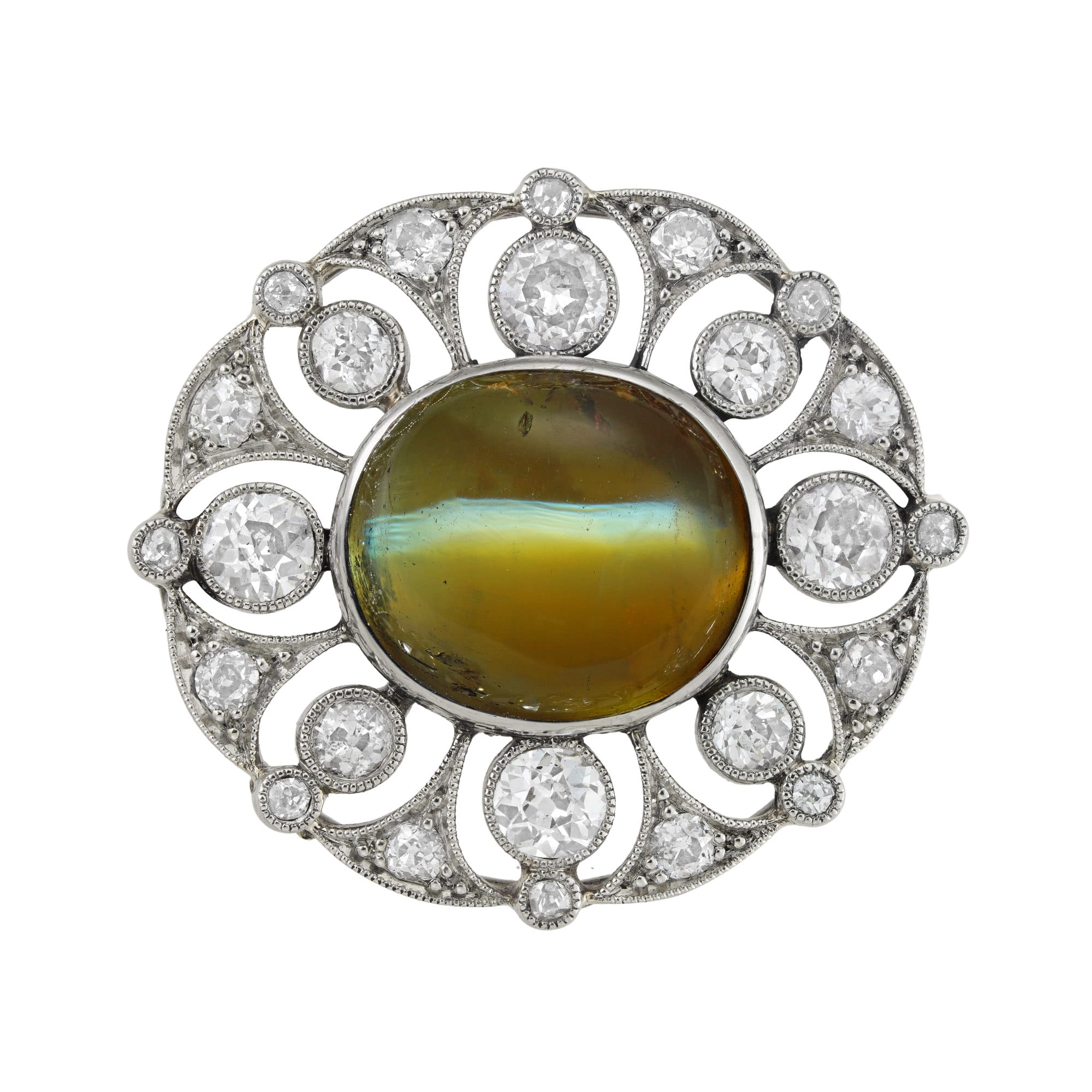More informationAn Edwardian oval chrysoberyl cats-eye and diamond brooch, the central oval cabochon chrysoberyl, measuring 11.6 x 10.3 millimetres and estimated to weigh approximately 7.5 carats, rubover-set to the centre of an openwork diamond-set oval plaque, the diamonds estimated to weigh a total of 2.5 carats, all millegrain-set in platinum, with platinum roller-catch fitting, circa 1910, meassuring 2.5×2.3cm, gross weight 7.4 grams.