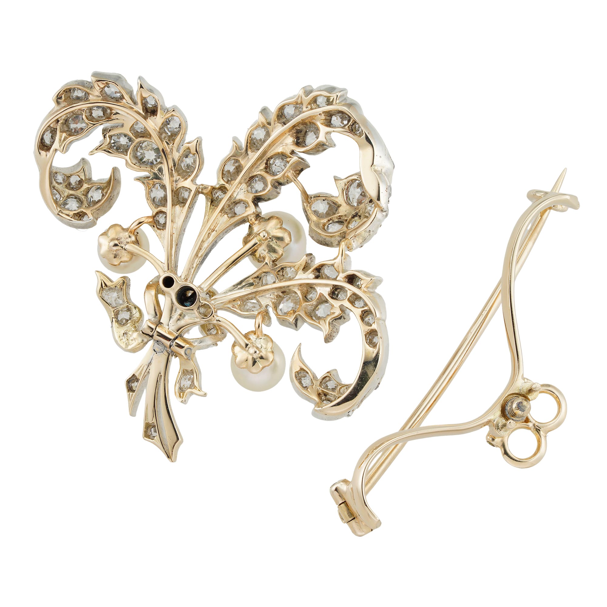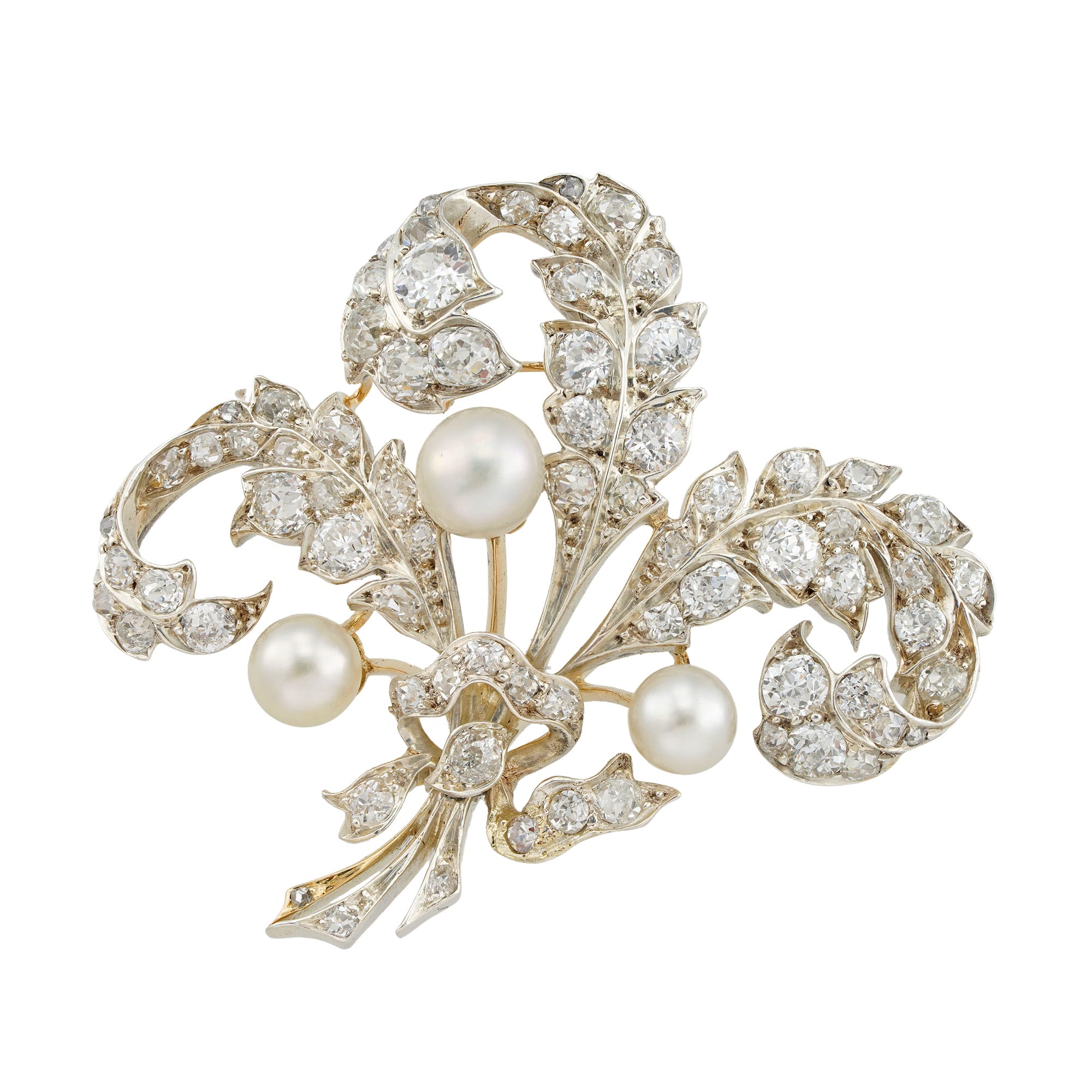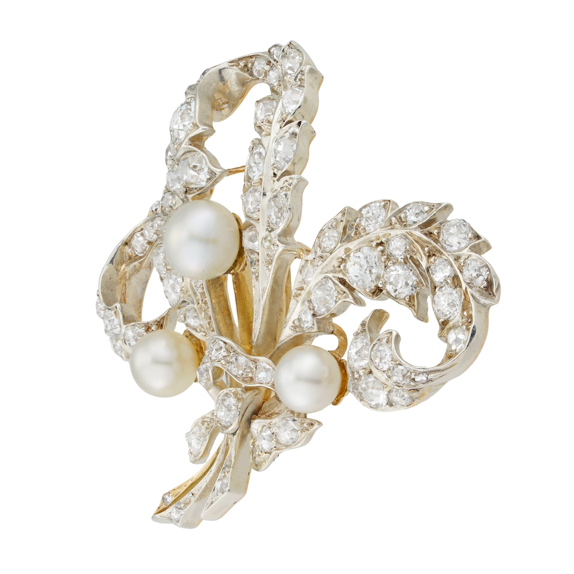 More informationA Victorian natural pearl and diamond foliate spray brooch, featuring three natural pearls of creamy lustre, accompanied by GCS Laboratory report stating to be natural of saltwater origin, with three naturalistic curling foliate branches, all encrusted with small old-European cut diamonds estimated to weigh approximately 3 carats in total, all set in silver with yellow gold back, with gold detachable brooch fitting, circa 1880, measuring approximately 3.7 x 3.5cm, gross weight 9.4 grams.