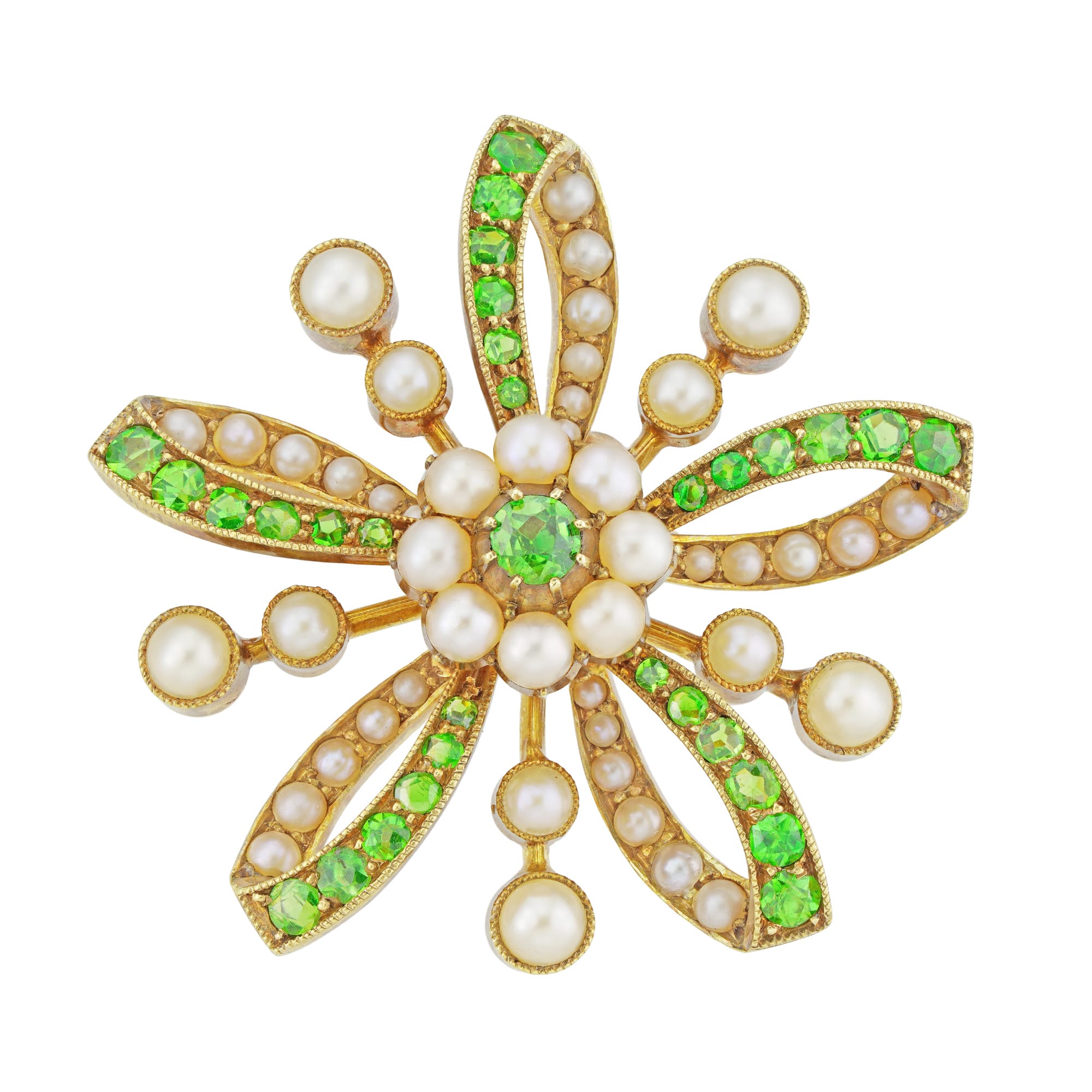 A Late Victorian demantoid garnet and pearl flower brooch/pendant, the central round faceted demantoid garnet, within a cut-down mount, surrounded by a cluster of eight half pearls, with five stylised petal loops mille-grain set with round faceted demantoid garnets and ...
