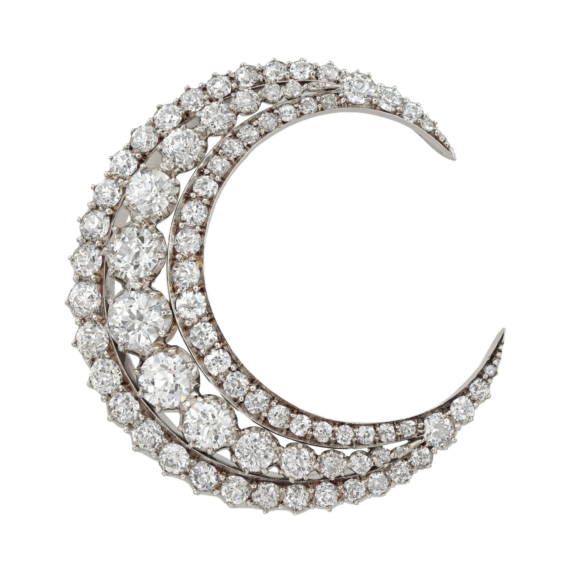 A Victorian diamond set crescent brooch, the central row consisting of seventeen old European-cut diamonds graduating in size from the centre, within a frame of smaller Old European and rose-cut diamonds, all graduated in size, the diamonds estimated to weigh ...