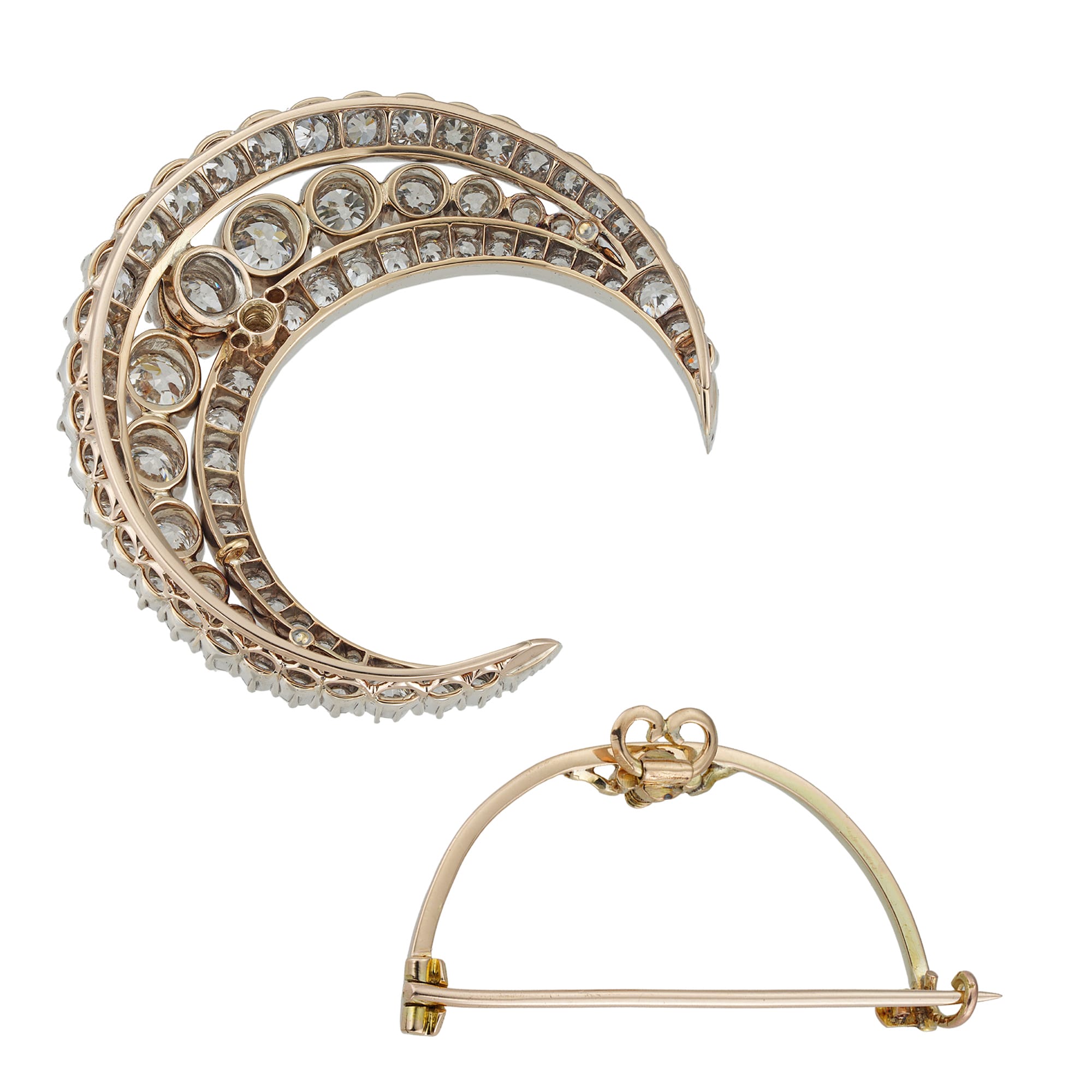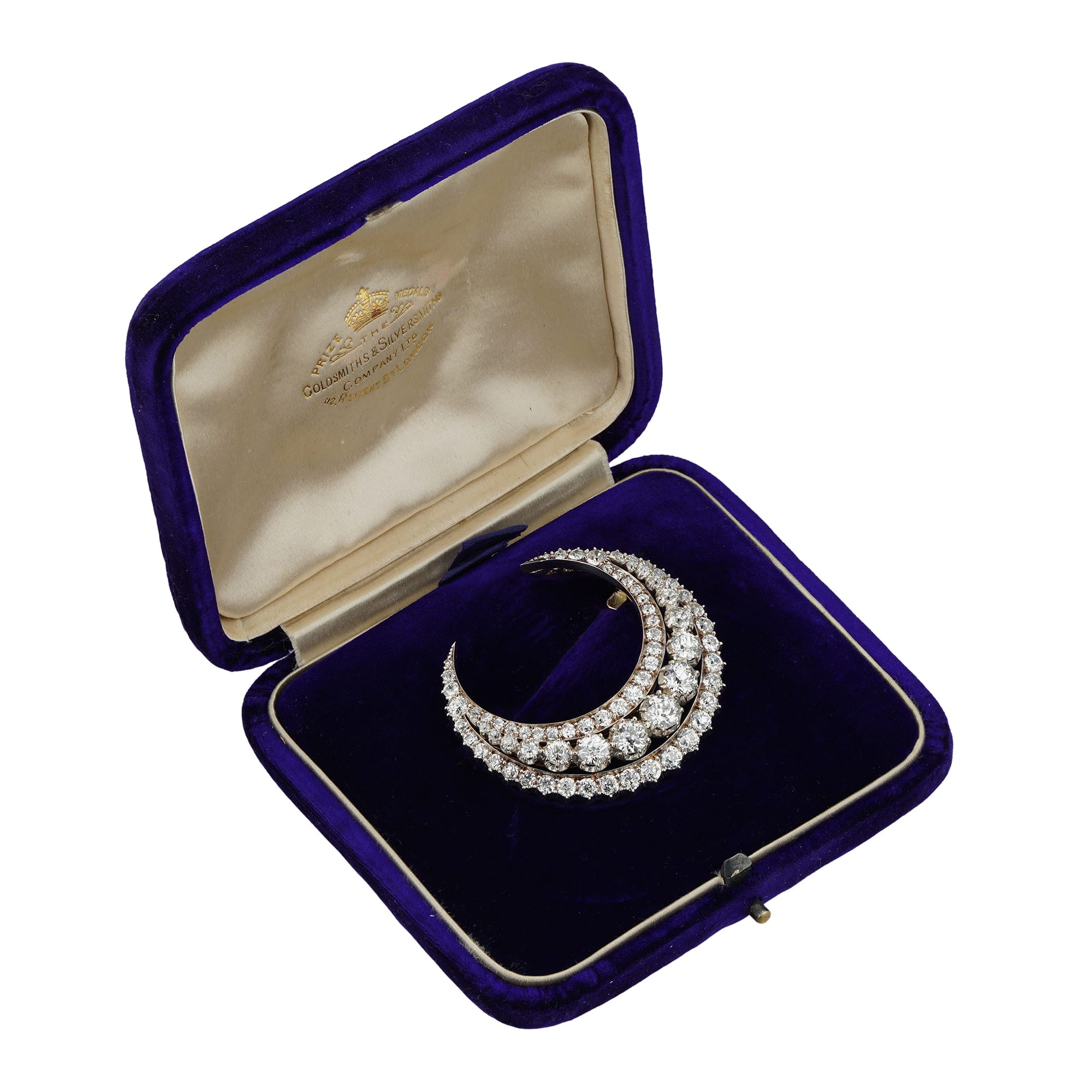More informationA Victorian diamond set crescent brooch, the central row consisting of seventeen old European-cut diamonds graduating in size from the centre, within a frame of smaller Old European and rose-cut diamonds, all graduated in size, the diamonds estimated to weigh 7½ carats in total, all cut-down set in silver with yellow gold back and detachable gold brooch fitting, accompanied by a gilt metal hairpin fitting, in an original fitted case stamped Goldsmiths and Silversmiths Company, circa 1890, measuring approximately 4.4 x 4.0cm, gross weight 15.8 grams.