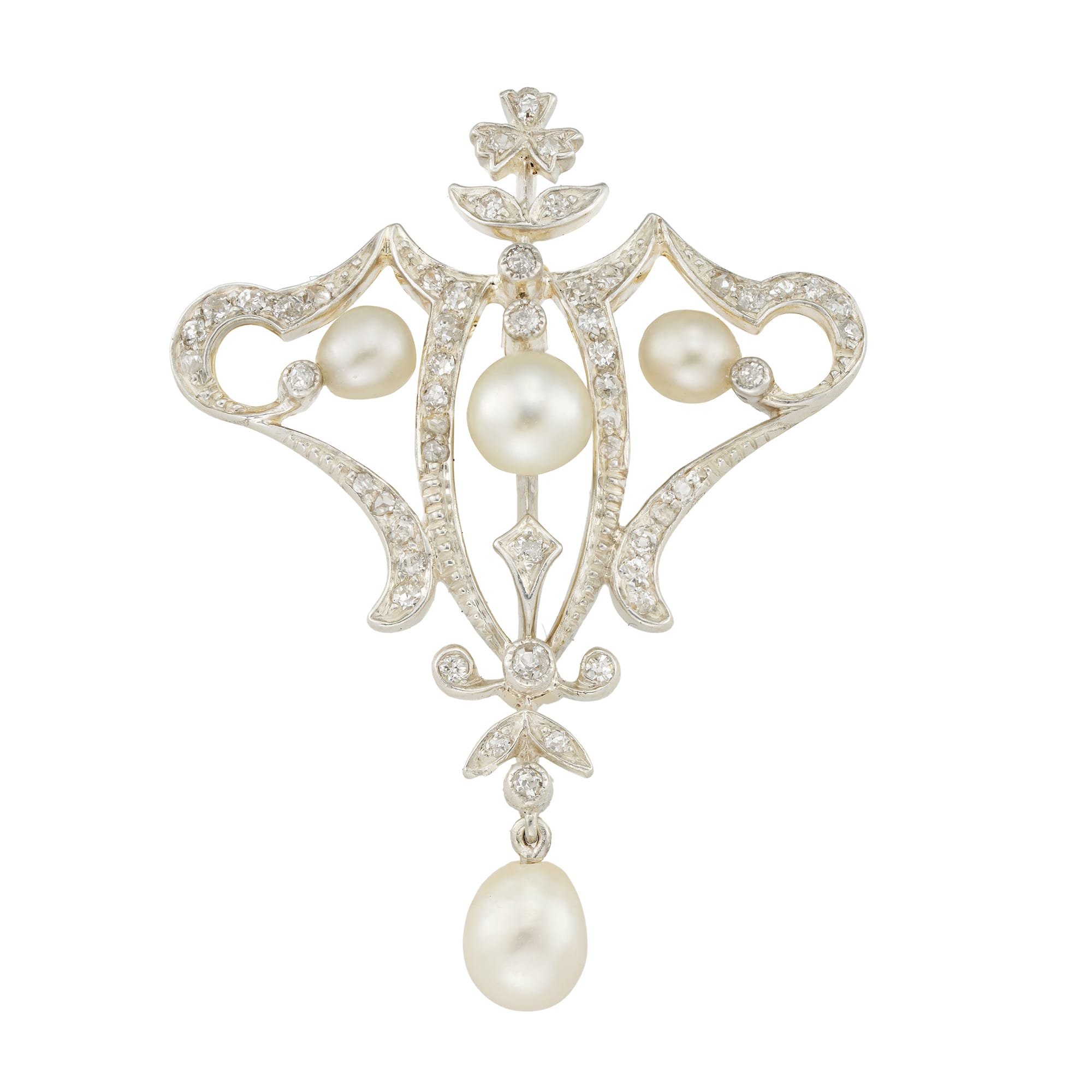 An Edwardian natural pearl and diamond brooch/pendant, centrally-set with a cream pearl measuring approximately 6mm in diameter, between two smaller pearls of similar lustre, to a diamond-set scrolling openwork surmount, terminating to a pearl drop, measuring approximately 7mm, accompanied by ...