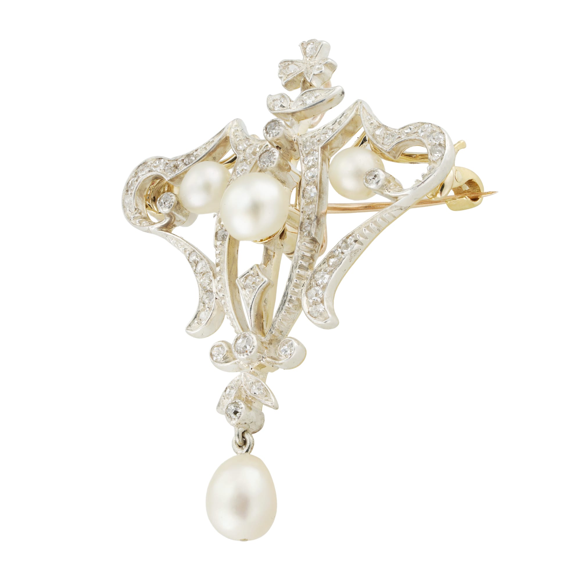 More informationAn Edwardian natural pearl and diamond brooch/pendant, centrally-set with a cream pearl measuring approximately 6mm in diameter, between two smaller pearls of similar lustre, to a diamond-set scrolling openwork surmount, terminating to a pearl drop, measuring approximately 7mm, accompanied by GCS Report stating that the pearls are natural of saltwater origin, all set in silver to a gold mount, with detachable brooch fitting, circa 1900, measuring approximately 4.5 x 3.3cm, gross weight 7.3 grams, in original fitted case.