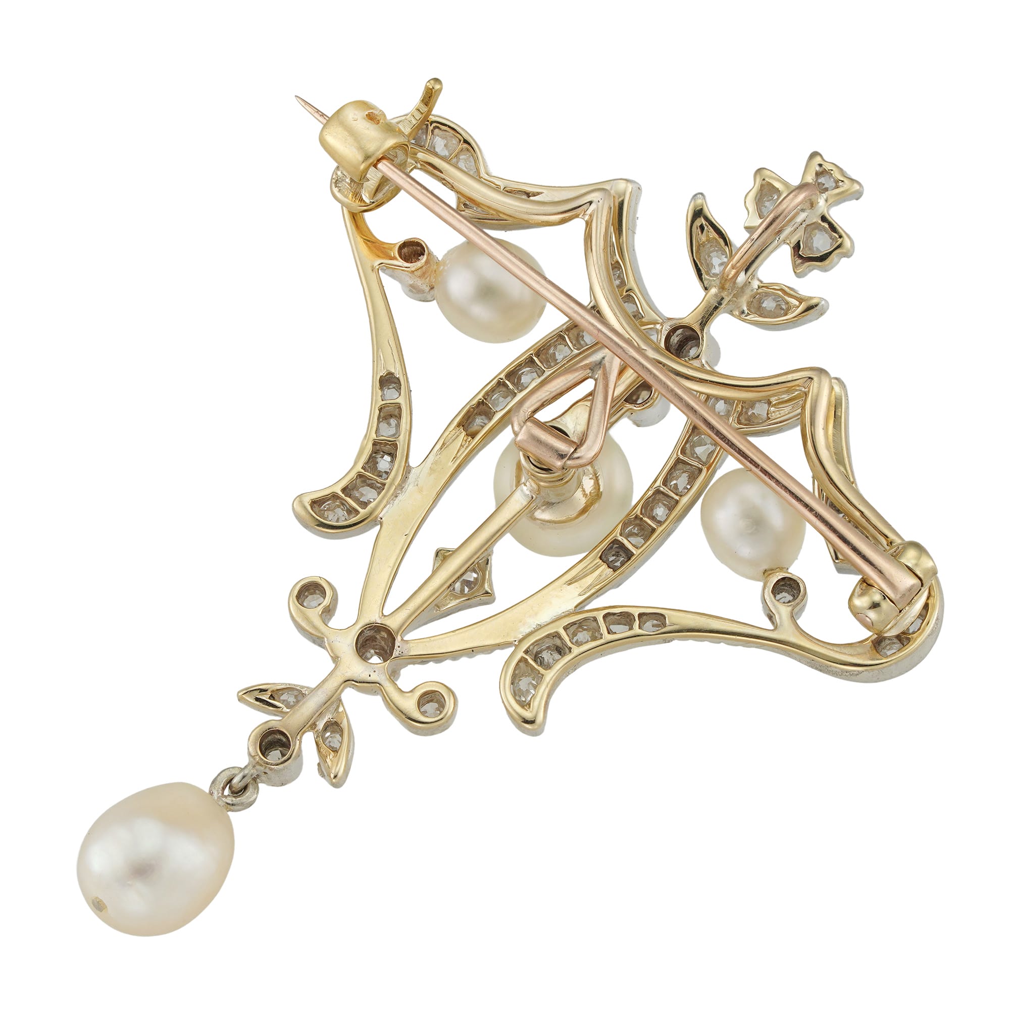 An elegant diamond and pearl brooch. A wonderful example of this period in jewellery design, where we are still seeing elements of the Victorian era, starting to merge and develop into the Edwardian and subsequent Belle Epoque period of design. In keeping with this period, this brooch also can be transformed into a pendant, making it a highly wearable piece depending upon the occasion. As a brooch, this would look perfect pinned to a stylish waistcoat or lapel. As a pendant, suspended from a white gold or platinum chain, this would be the perfect piece for a wedding dress with a V-neck.