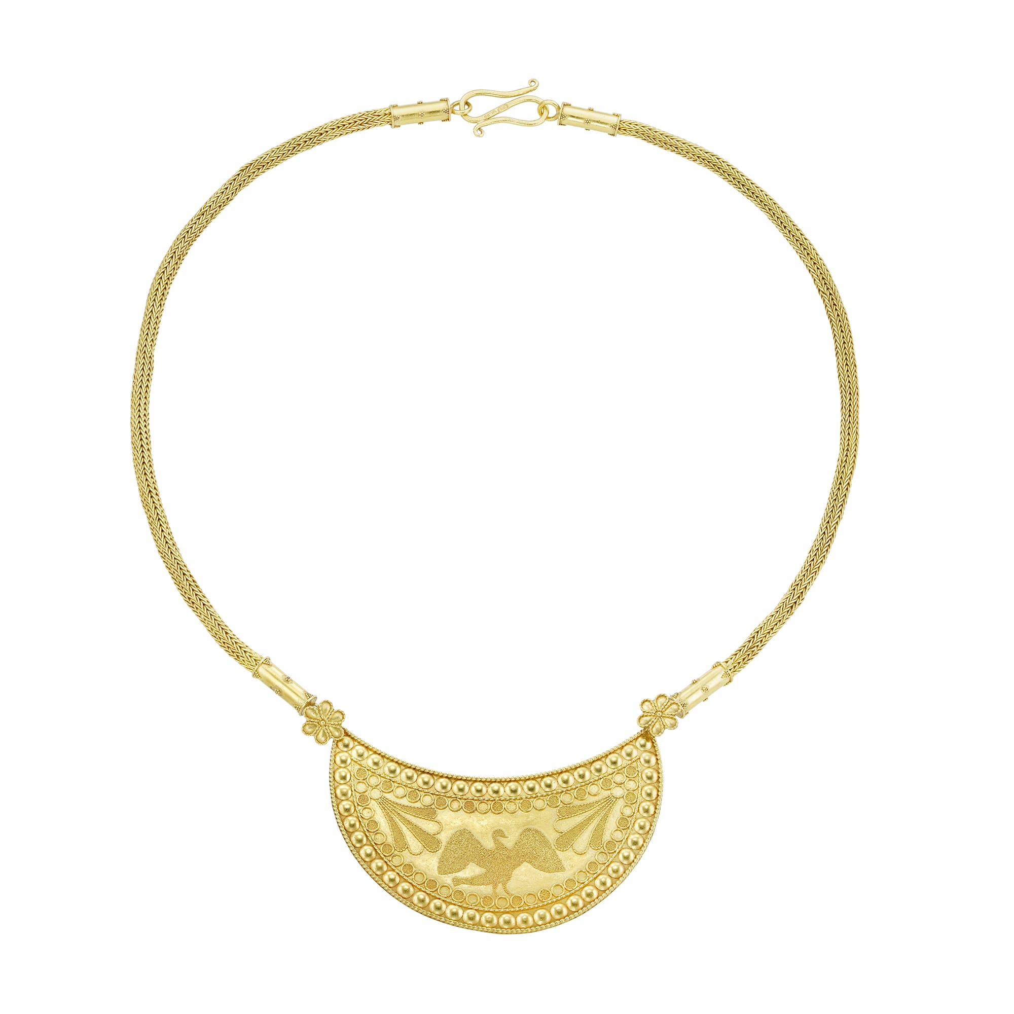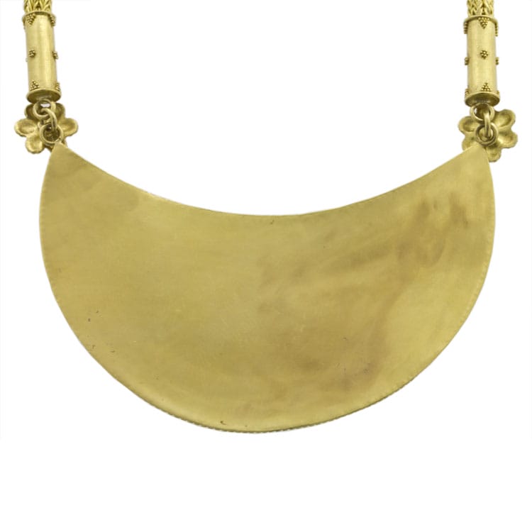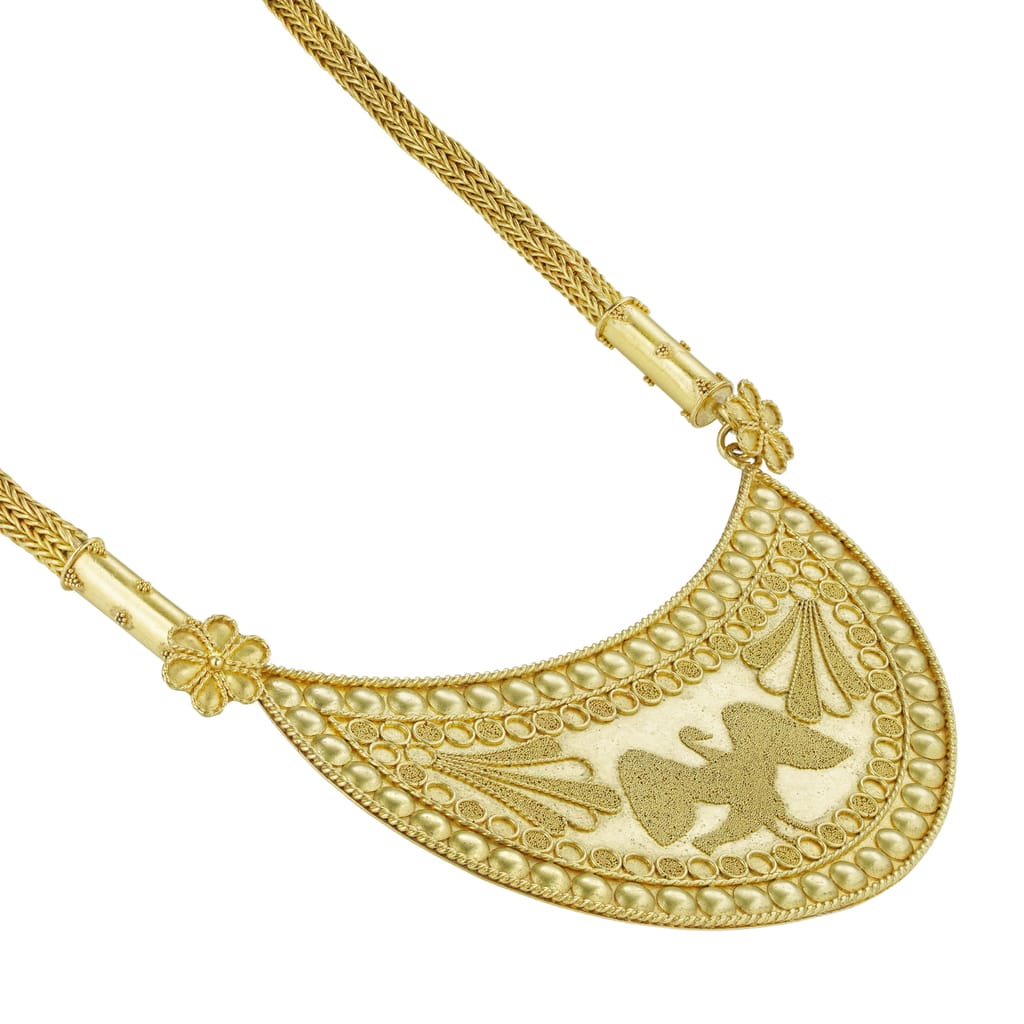 A gold plaque necklace by Akelo, the horizontal crescent-shaped plaque decorated with a central zoomorphic motif of a bird turned toward the right between lotus petals and a circle motif, rendered using filigree and “fine dust” granulation, within a raised ...