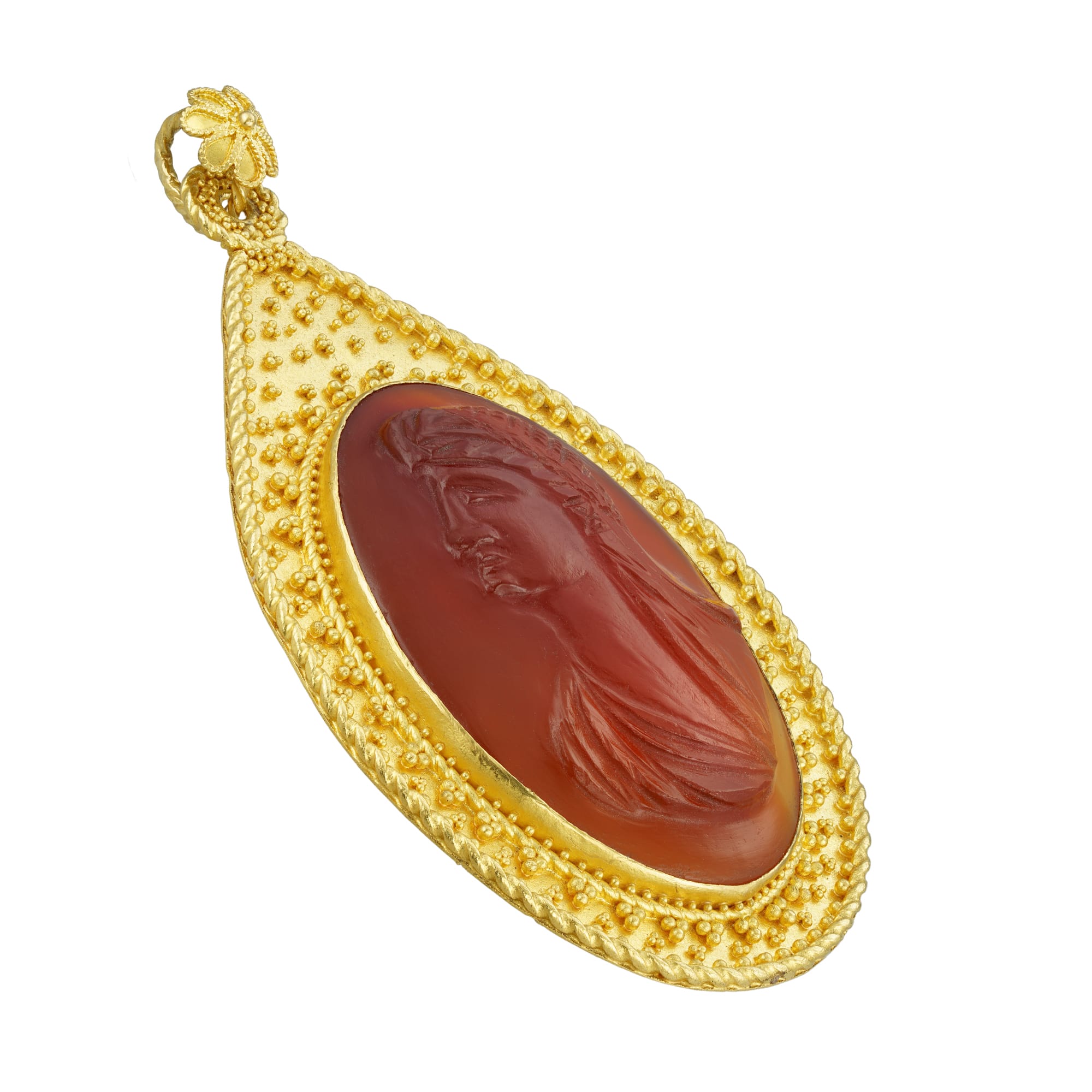 More informationA gold and carnelian pendant by Akelo, the oval carnelian engraved with the profile of a lady with headdress and long flowing hair, rub-over set within a drop-shaped gold frame, embellished with granulation clusters and a twisted wire work border, to a pendant loop and ornamental filigreed rosette, all in yellow gold, hallmarked 18ct gold, London, made by Andrea Cagnetti the Roman master goldsmith known as Akelo, measuring approximately 7.1 x 4.3cm, gross weight 30.4 grams.