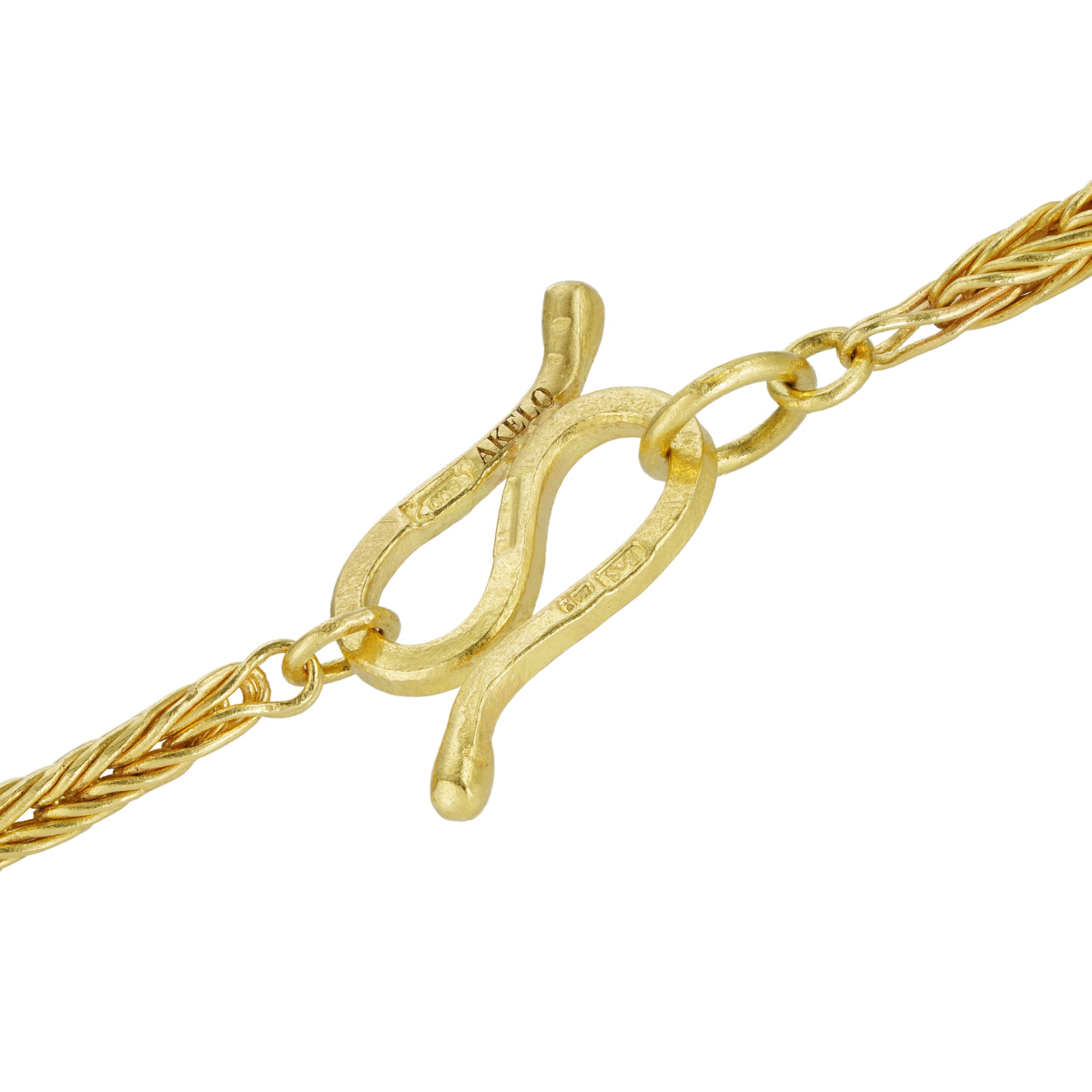 A beautiful chain necklace handmade by AKELO. Andrea Cagnetti, the Roman master goldsmith known as Akelo, is an academic jeweller, sculptor and designer known for his trademark techniques of micro granulation and filigree. This detailed necklace is made of buttery yellow gold wire links intricately weaved into an articulated rope-like chain. Simple and tasteful, this necklace can be worn with an elegant dress or as an everyday accessory.