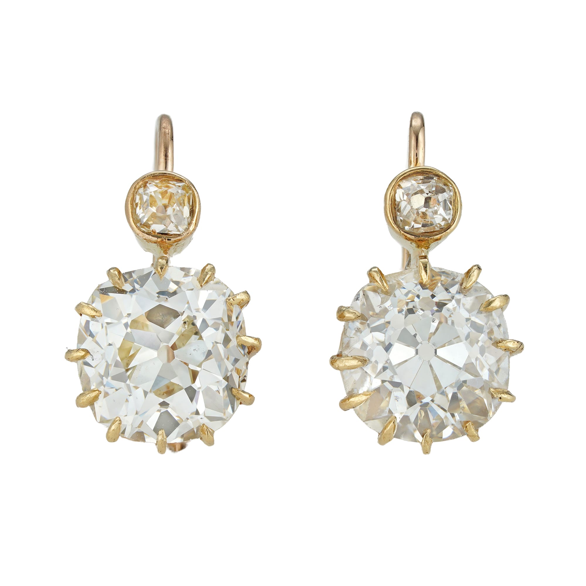 A magnificent pair of diamond earrings. These earrings each feature two old mine-cut diamonds, the larger of the two weighing just shy of three carats. The dazzling and romantic diamonds catch the light beautifully and are claw set in yellow gold. These stunning and scintillating earrings were made at the turn of the twentieth century and capture the opulence of the Belle Epoque. This pair of earrings would be an eye-catching addition to an evening gown.