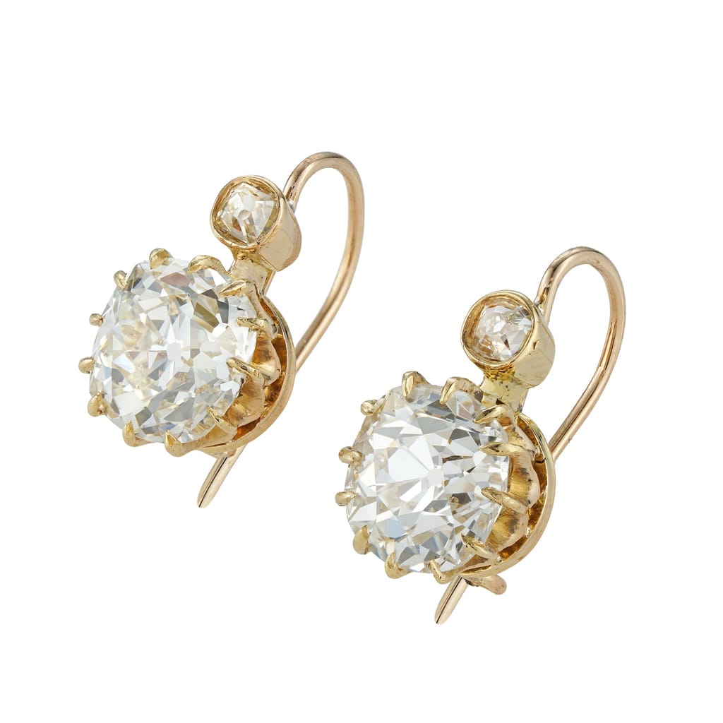 More informationAn antique pair of old-cut diamond drop earrings, each earring with a large old mine-cut diamond, the one weighing 2.87 carats of M colour and VS1 clarity, the other weighing 2.91 carats of M colour and SI2 clarity, both accompanied by GCS Report, each suspended by a small old-cut diamond estimated to weigh 0.15 carats, mounted in yellow gold with continental hook fittings, circa 1900, measuring approximately 1.7 x 0.9cm, gross weight 4.7 grams.