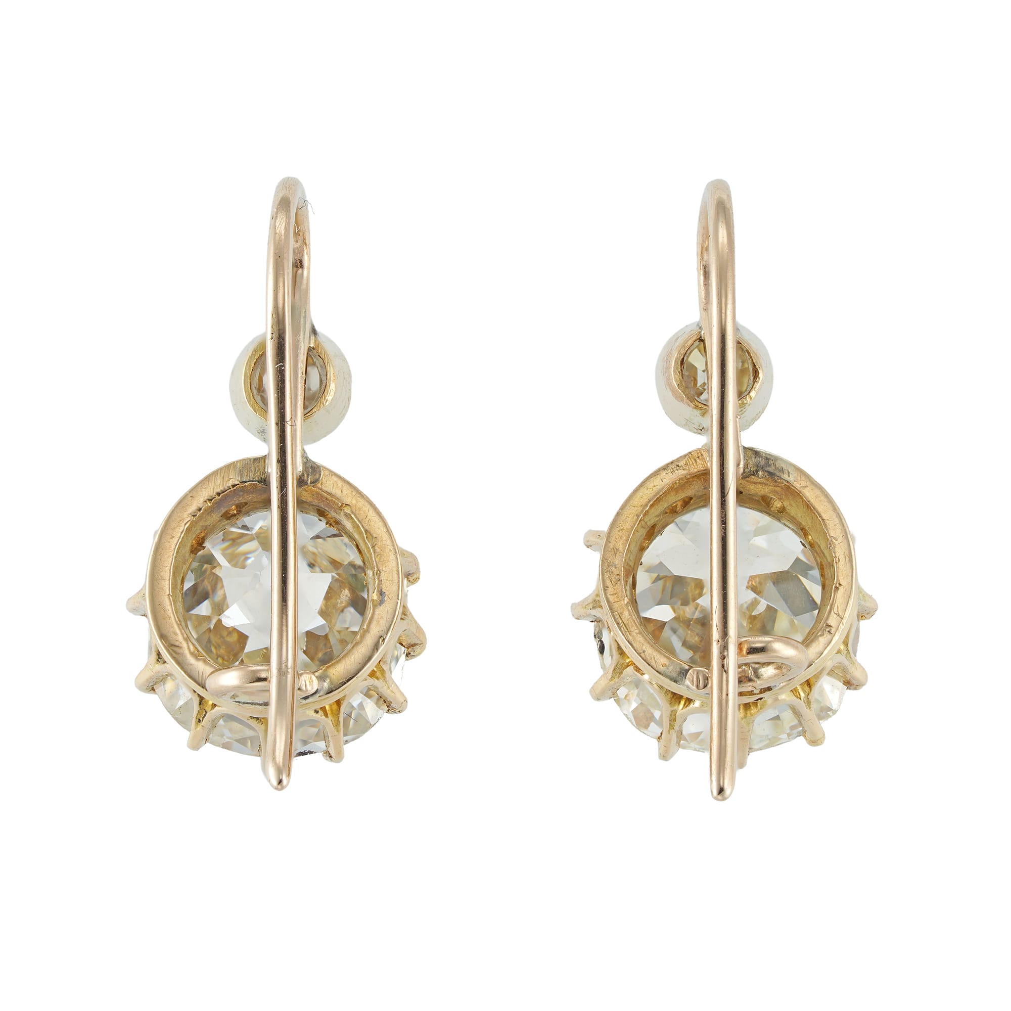 An antique pair of old-cut diamond drop earrings, each earring with a large old mine-cut diamond, the one weighing 2.87 carats of M colour and VS1 clarity, the other weighing 2.91 carats of M colour and SI2 clarity, both accompanied ...