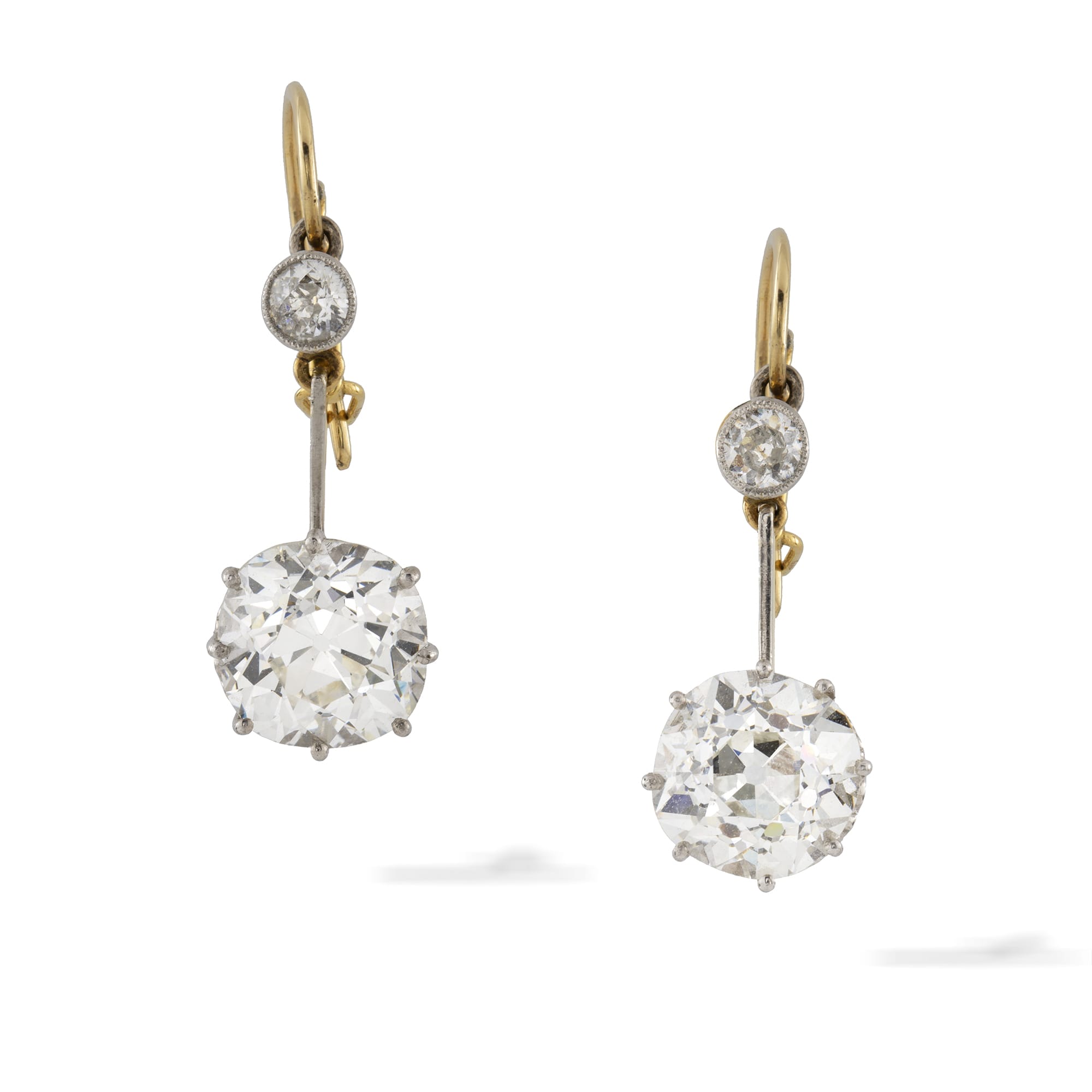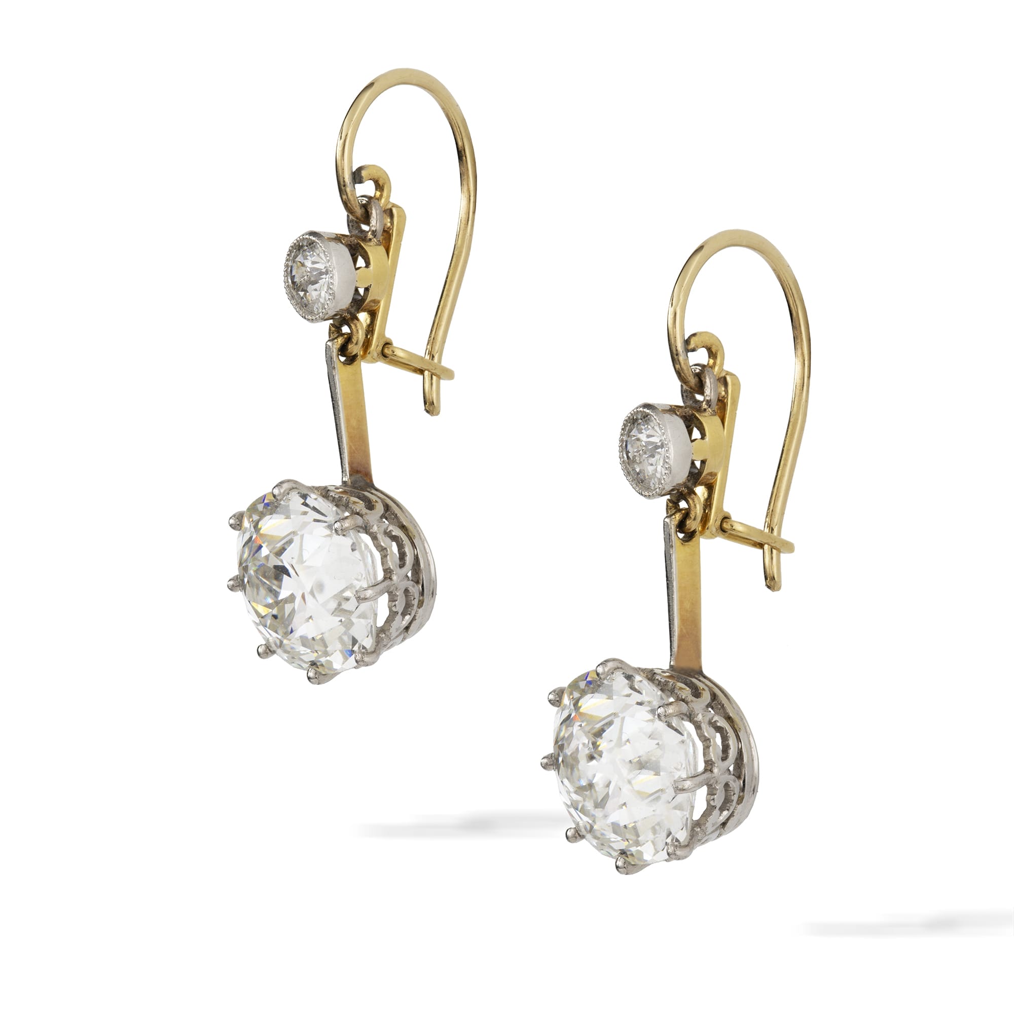 An exquisite pair of late Victorian earrings. These earrings each feature a lively diamond connected to a hook fitting. From the fitting is a platinum bar, suspending a scintillating old-cut diamond weighing over three carats. The two impressive diamonds catch the light beautifully: the old-cut diamonds have a wonderful antique allure to them. These important earrings would be a sparkling addition to a black tie gown.