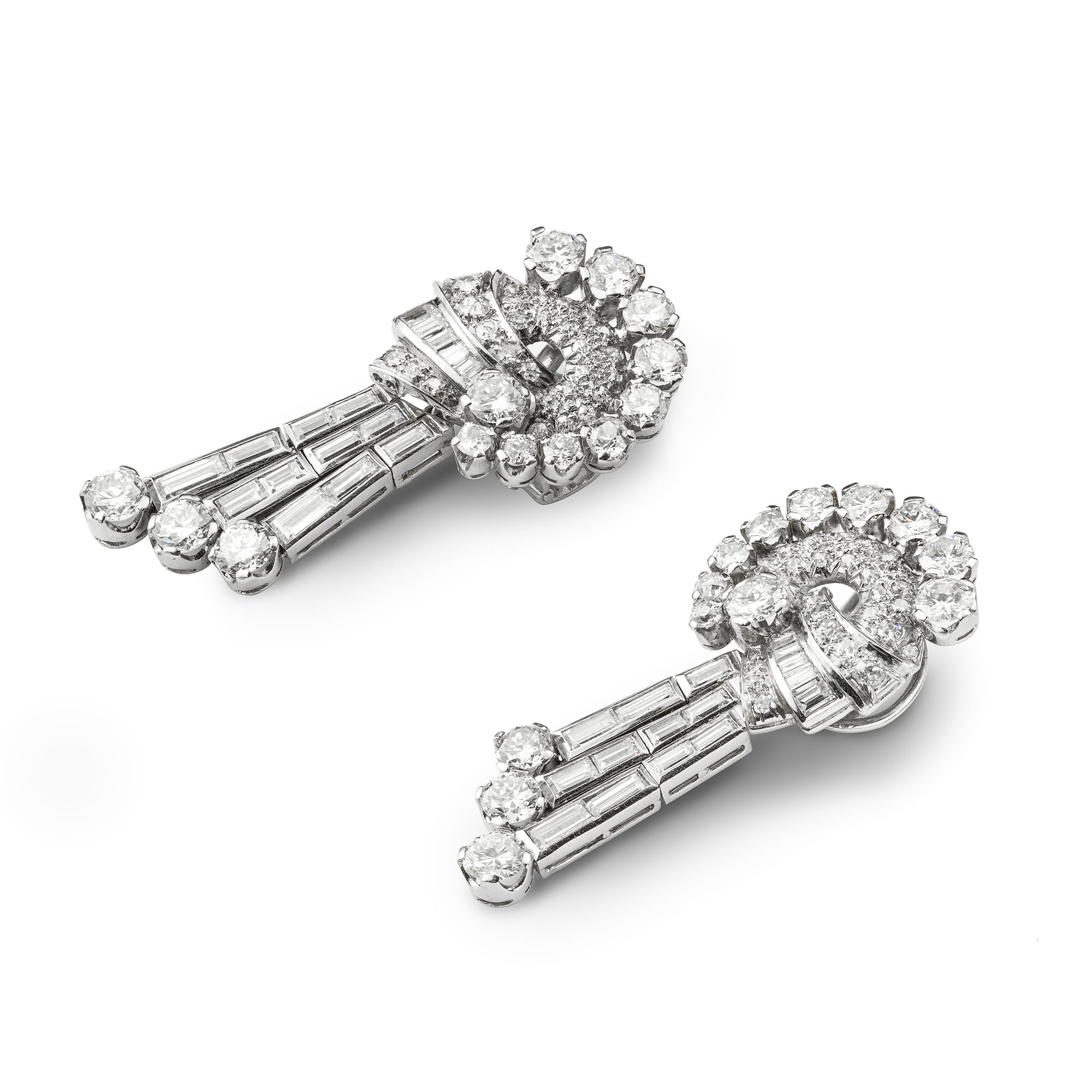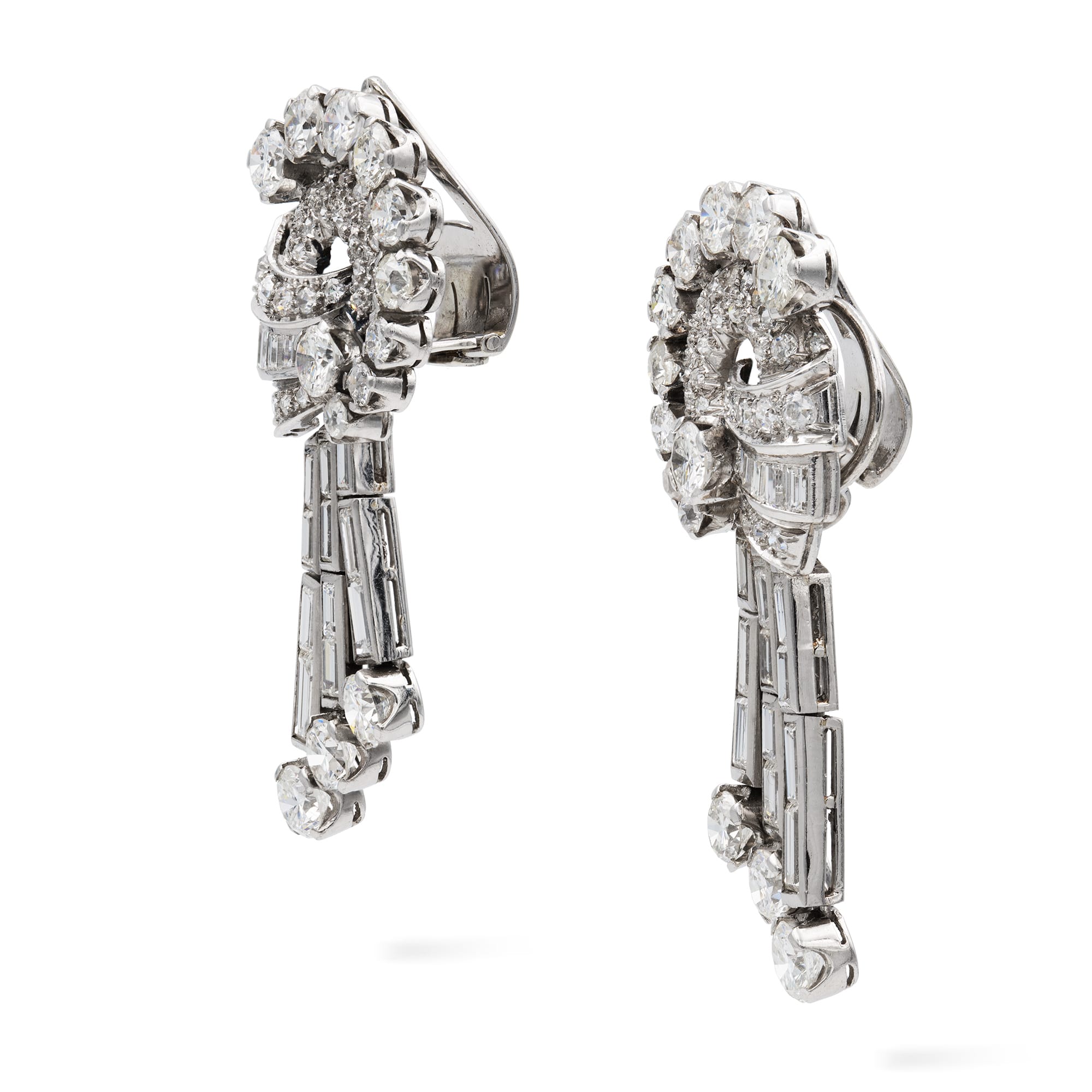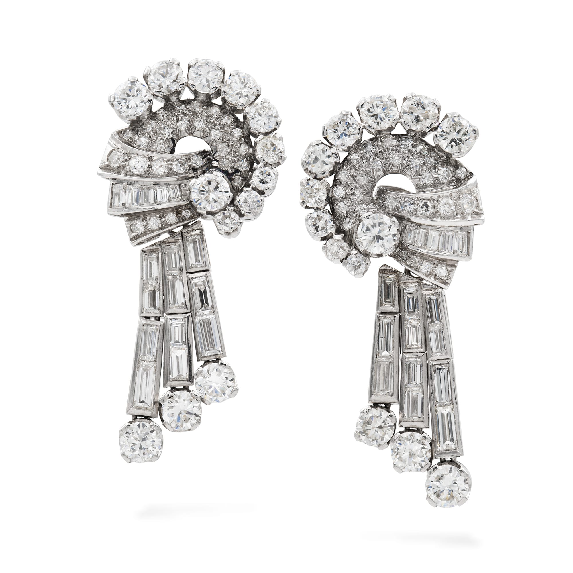 More informationA Pair Of Mid 20th Century Diamond Drop Earrings, consisting of a triple line drop, all set with round brilliant, baguette and Swiss-cut diamonds estimated to weigh a total of 8 carats, mounted in platinum and white gold, with white gold clip fittings, circa 1950, measuring approximately 4.3 x 2cm, gross weight 21.66 grams.
