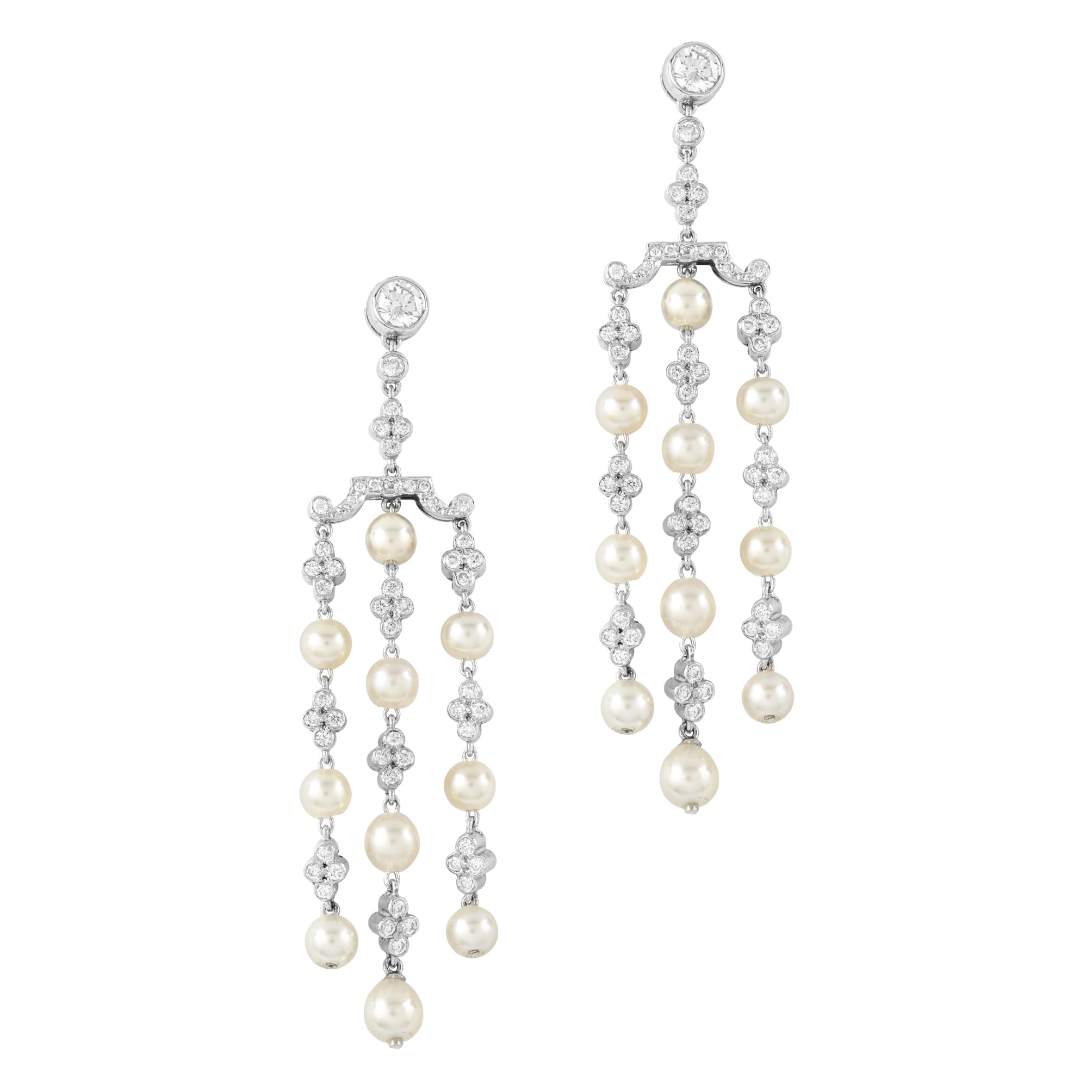 A pair of natural pearl and diamond tassel drop earrings, each earring comprising three drop tassels of ten natural pearls, accompanied by a Gem & Pearl Laboratory report, with a quatrefoil diamond cluster in between each pearl suspended from a ...