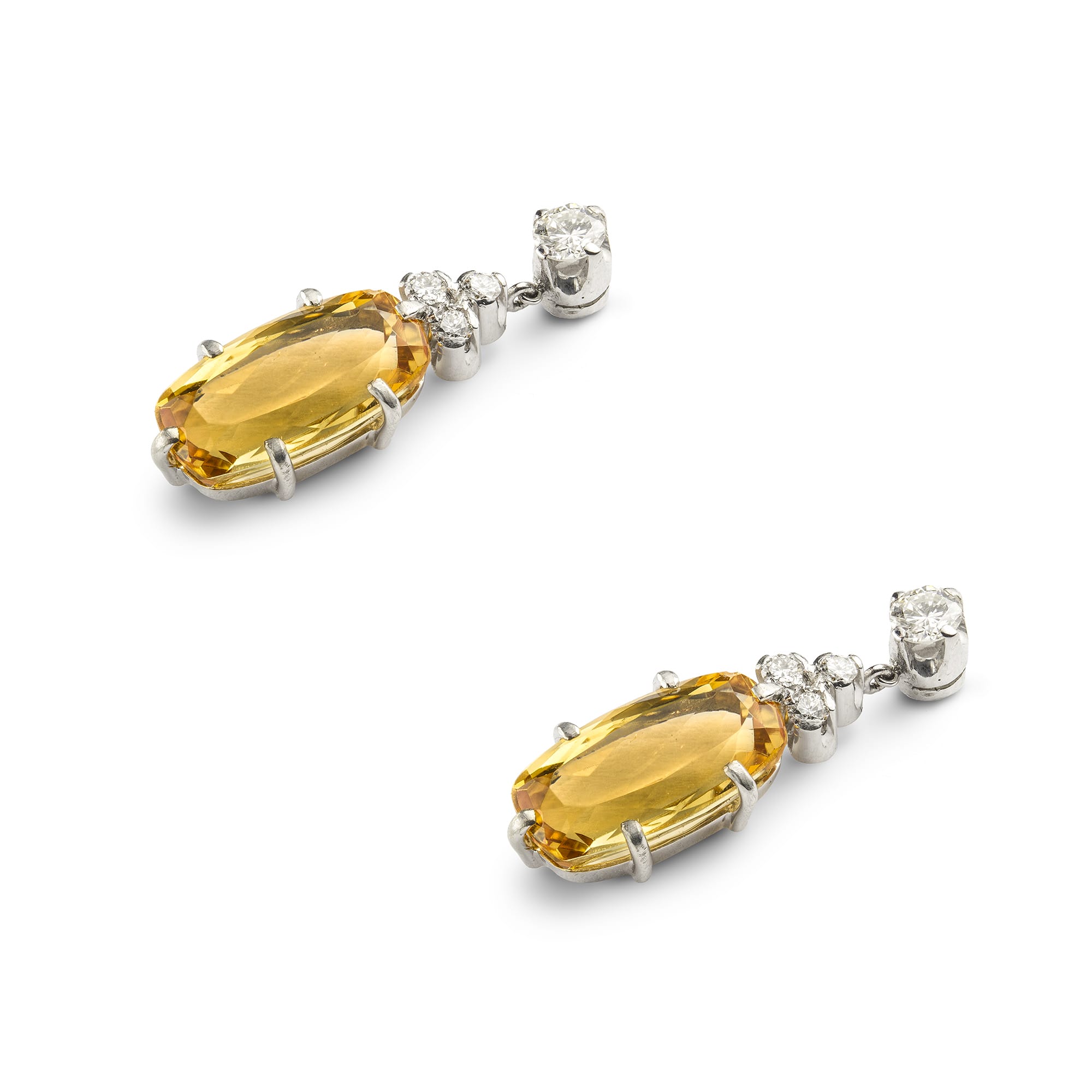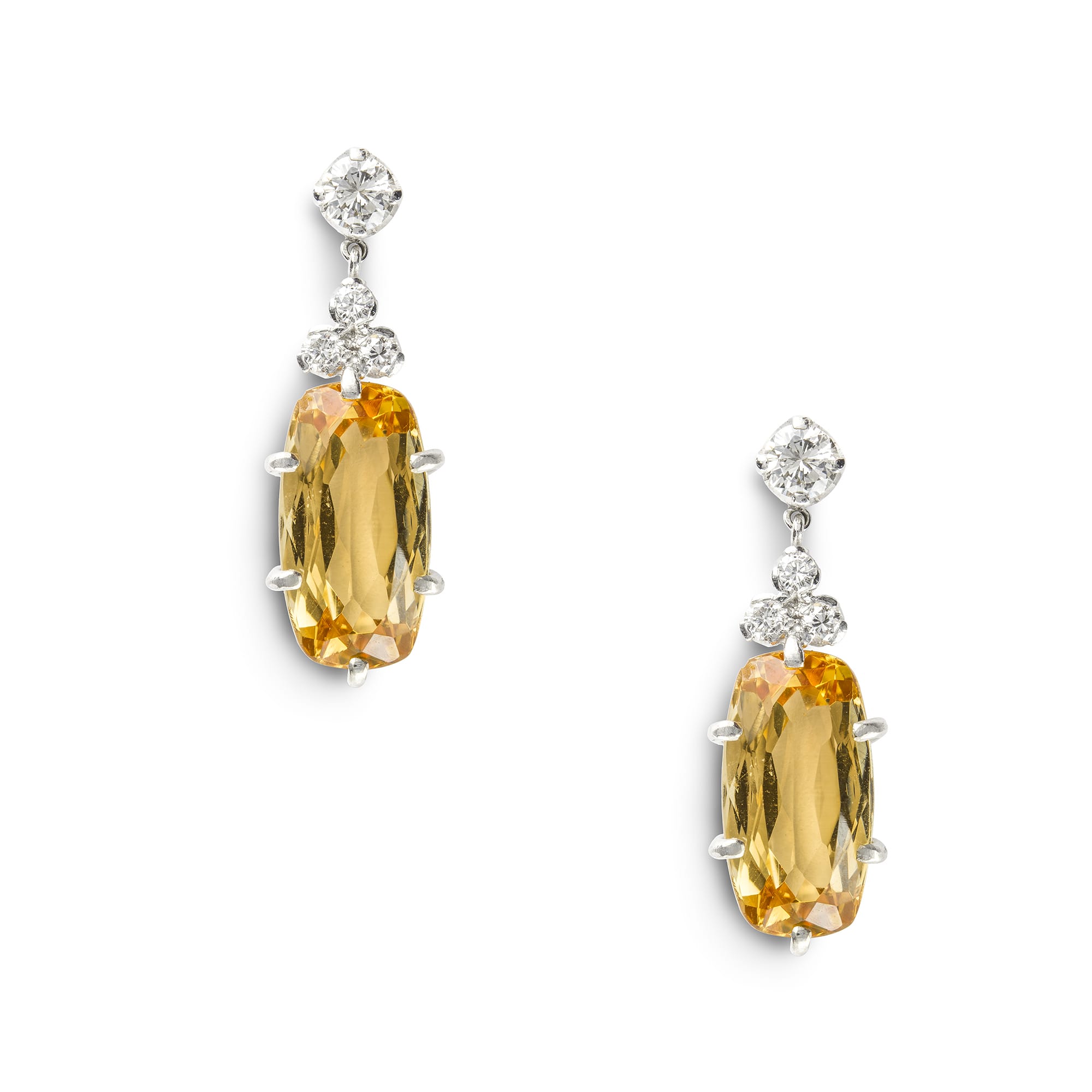 A pair of topaz and diamond drop earrings, each earring with an oval faceted topaz estimated to weigh 6 carats for the pair, each surmounted by round brilliant-cut diamond trefoil suspended from a single round brilliant-cut diamond top, the diamonds ...