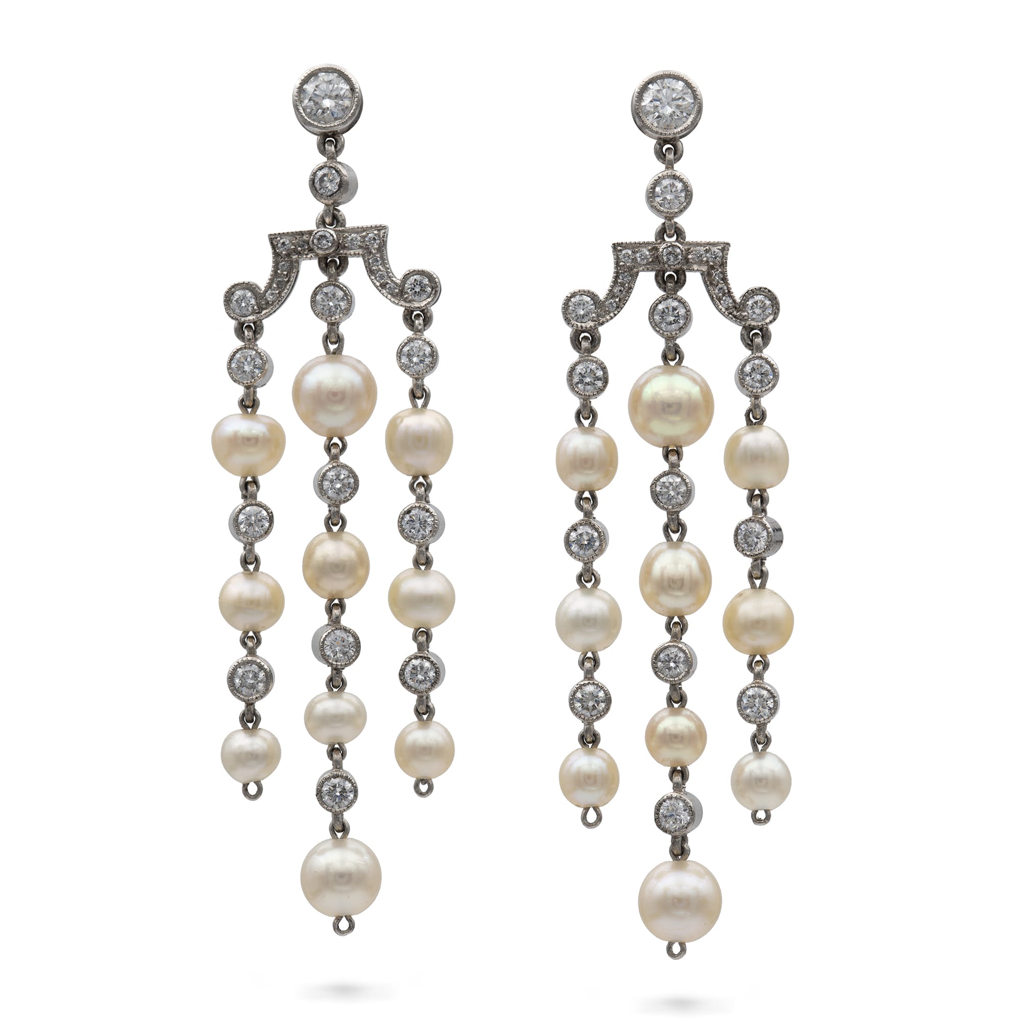 A pair of natural pearl and diamond tassel drop earrings, each earring comprising three drop tassels of ten natural pearls, accompanied by a Gem & Pearl Laboratory report number 03833, with a single diamond in between each pearl suspended from ...