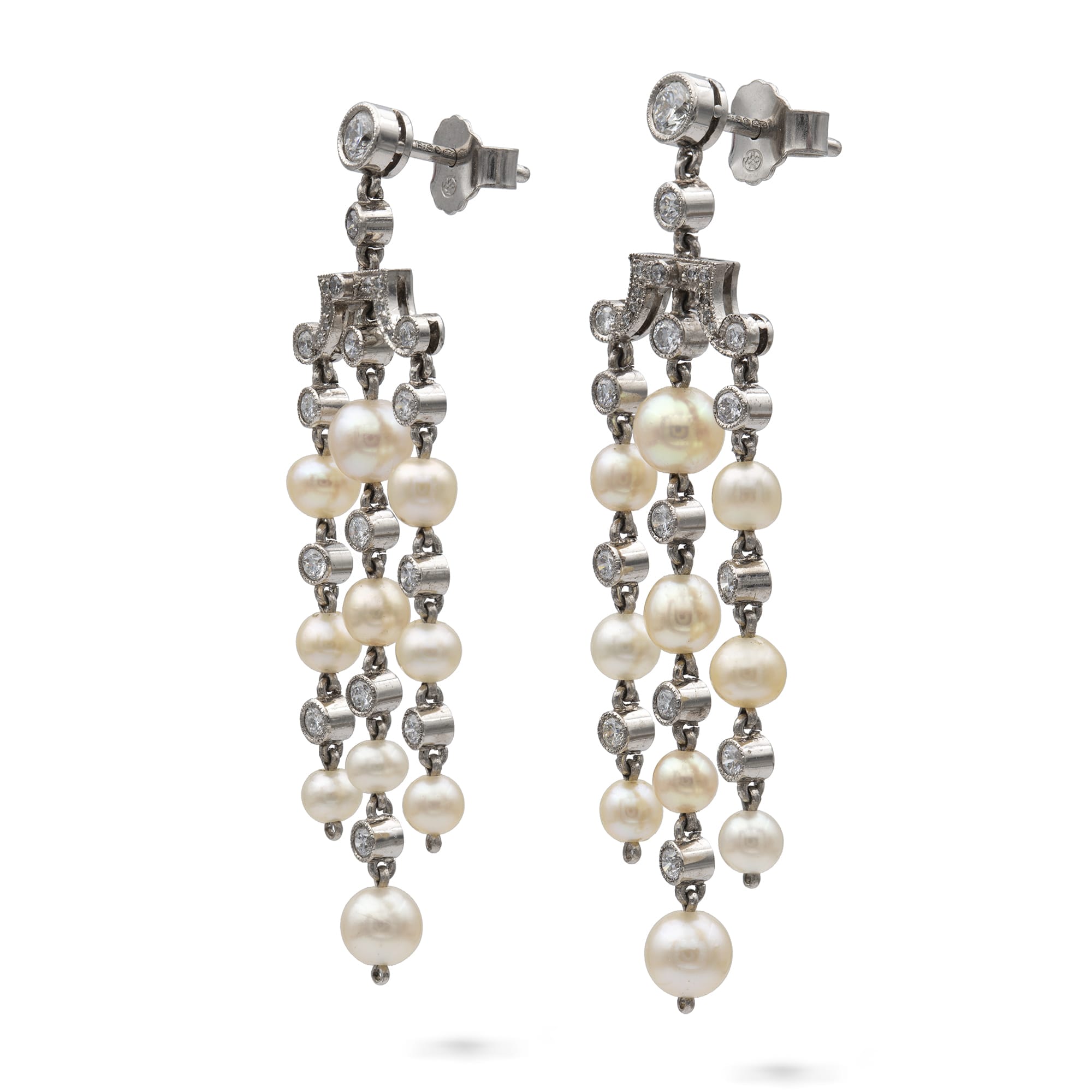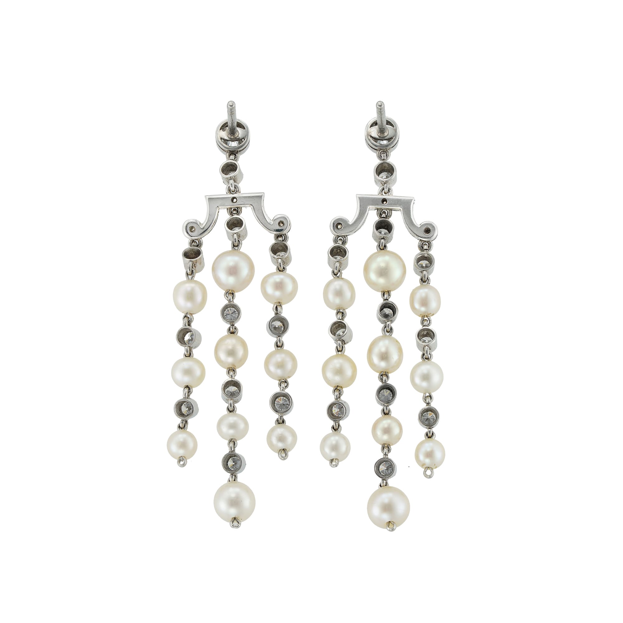 More informationA pair of natural pearl and diamond tassel drop earrings, each earring comprising three drop tassels of ten natural pearls, accompanied by a Gem & Pearl Laboratory report number 03833, with a single diamond in between each pearl suspended from a diamond set scrolled bar surmounted by two graduating diamonds, all set in platinum articulate mount and post and c-scroll fittings, hallmarked platinum, London 2017, made by Bentley & Skinner, measuring approximately 5cm long and 1.5 cm wide, gross weight 8.5 grams.