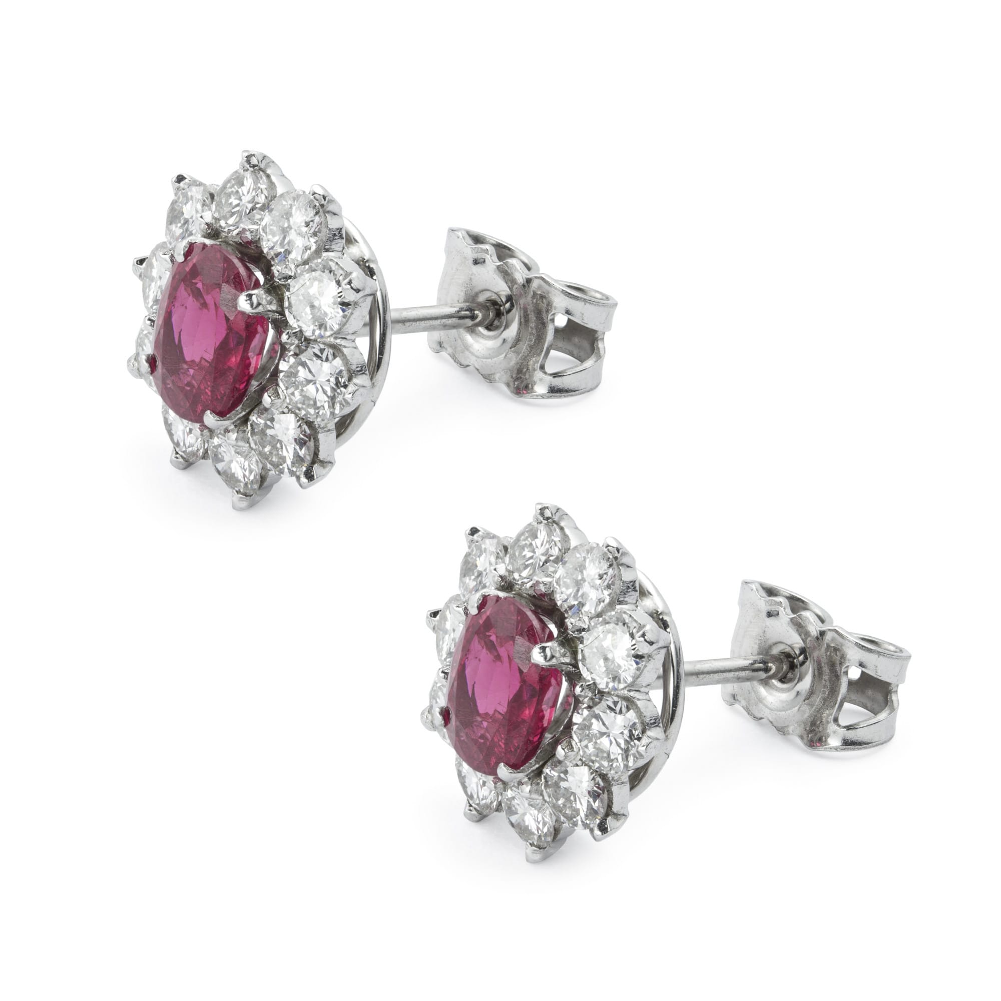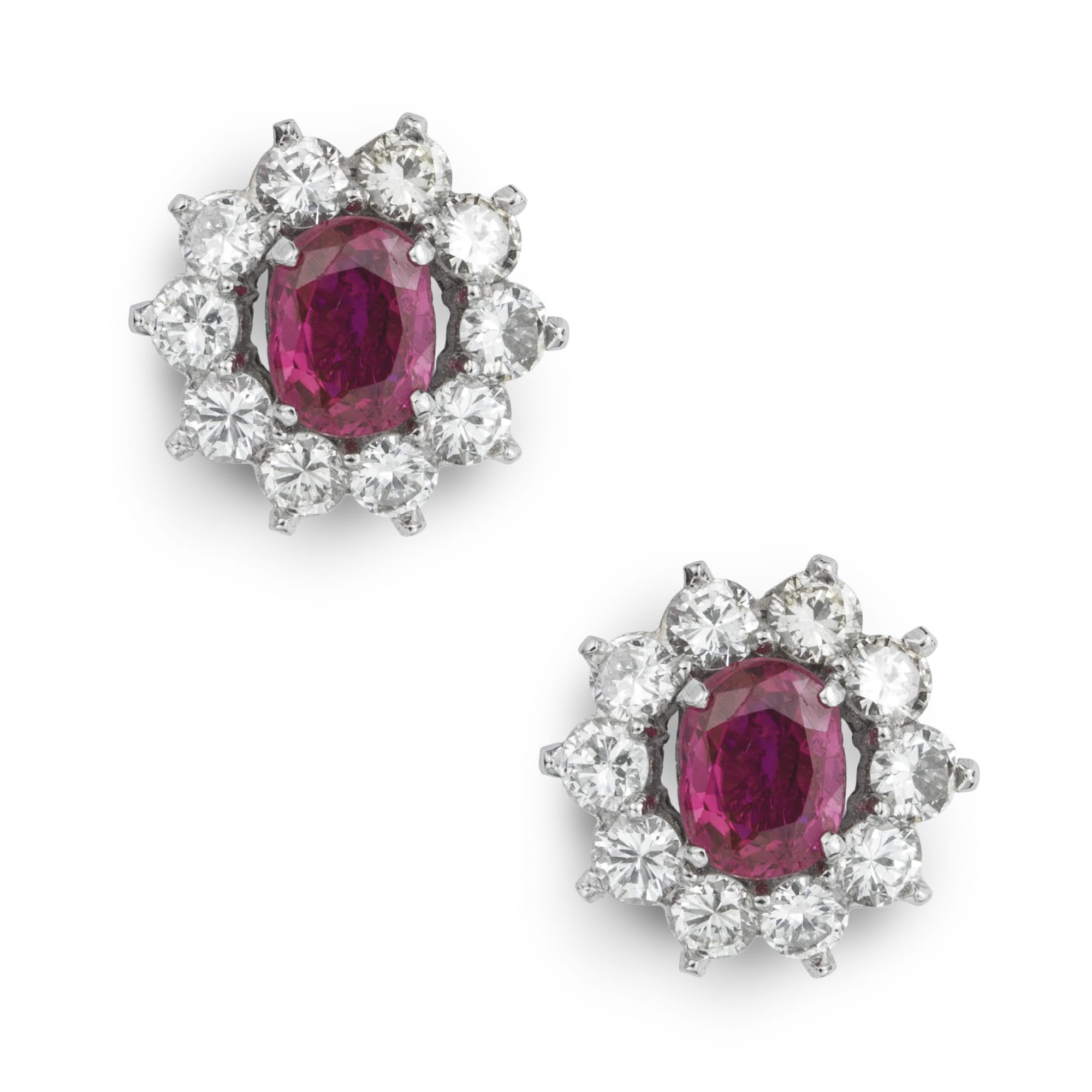 More informationA pair of ruby and diamond cluster stud earrings, each earring consisting of an oval faceted ruby weighing a total of 1.57 carats, accompanied by GCS report no:5777-7872, stating that are of Burmese origins with no indication of heat treatment, set to the centre of ten round brilliant-cut diamond-set cluster, weighing approximately 1.40cts in total, all claw set to a white mount, with post and C-scroll fittings, circa 1970, later hallmarked 18 carat gold, London 2017 bearing the Bentley & Skinner sponsor mark, gross weight 4.0 grams.