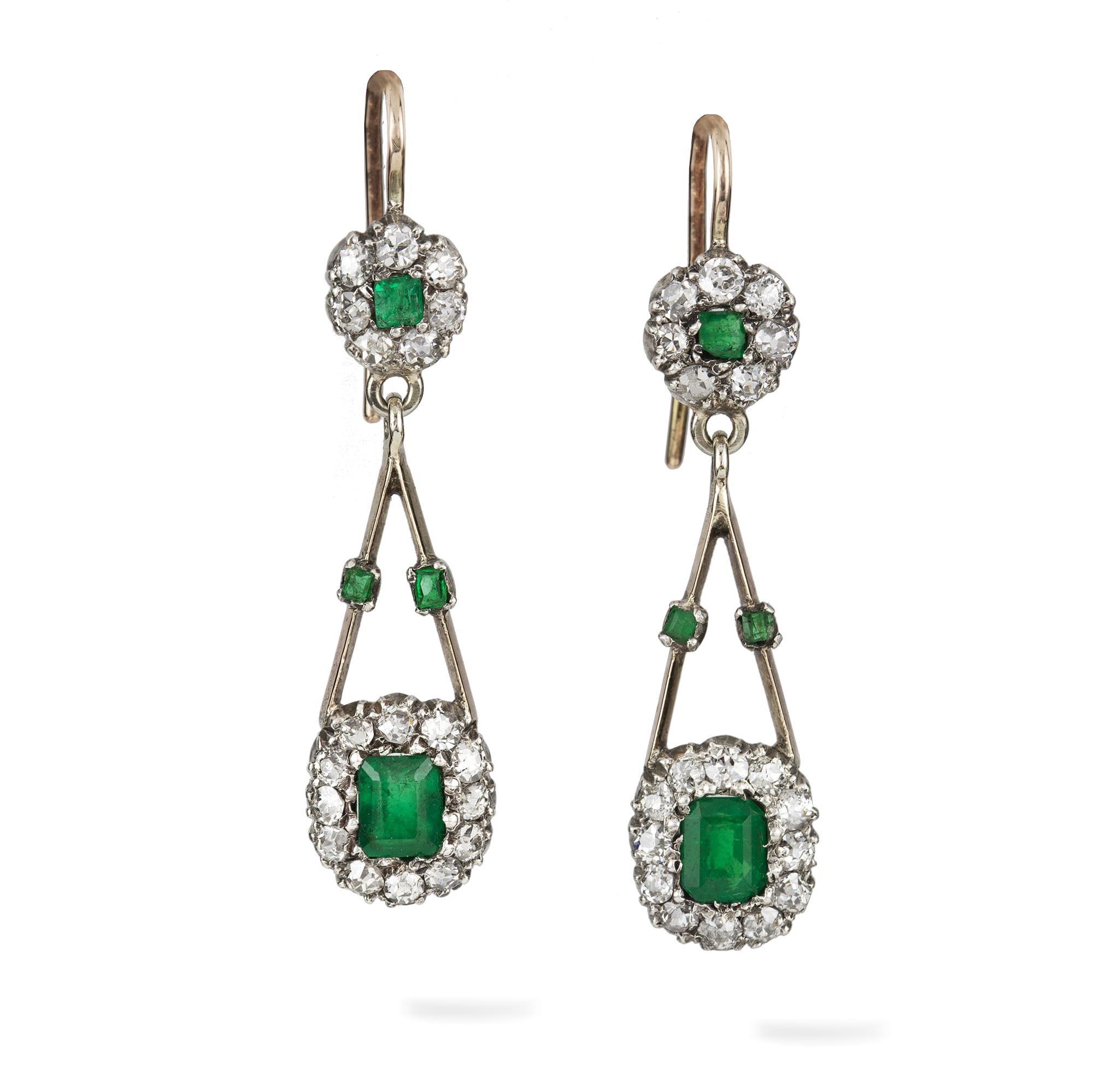 A pair of Edwardian emerald and diamond earrings, each earring with a cushion-cut emerald surrounded by twelve old-cut diamonds attached to two knife-edged gold bars forming a V, suspended by a cluster consisted of a square-cut emerald and seven old-cut ...