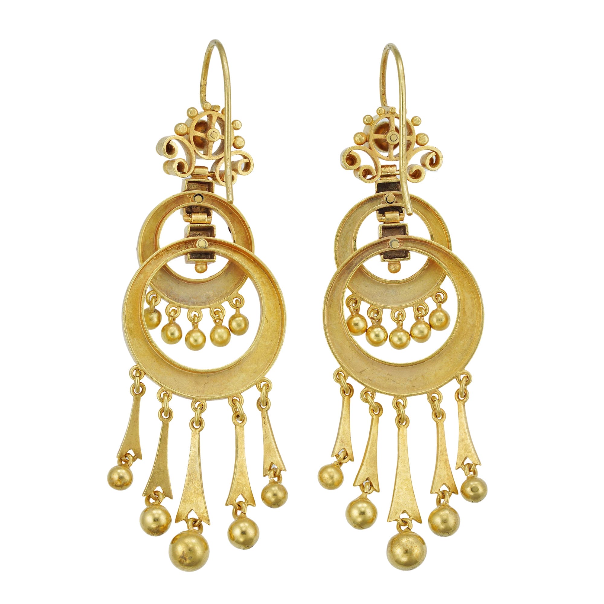 A gorgeous and exotic pair of Victorian earrings. Made in the mid-Victorian era when jewellery took stylistic influences from the ancient world, these revivalist earrings feature bright and lush yellow gold moulded into intricate circular shapes, culminating in gold drops. These drop earrings make a stunning statement.