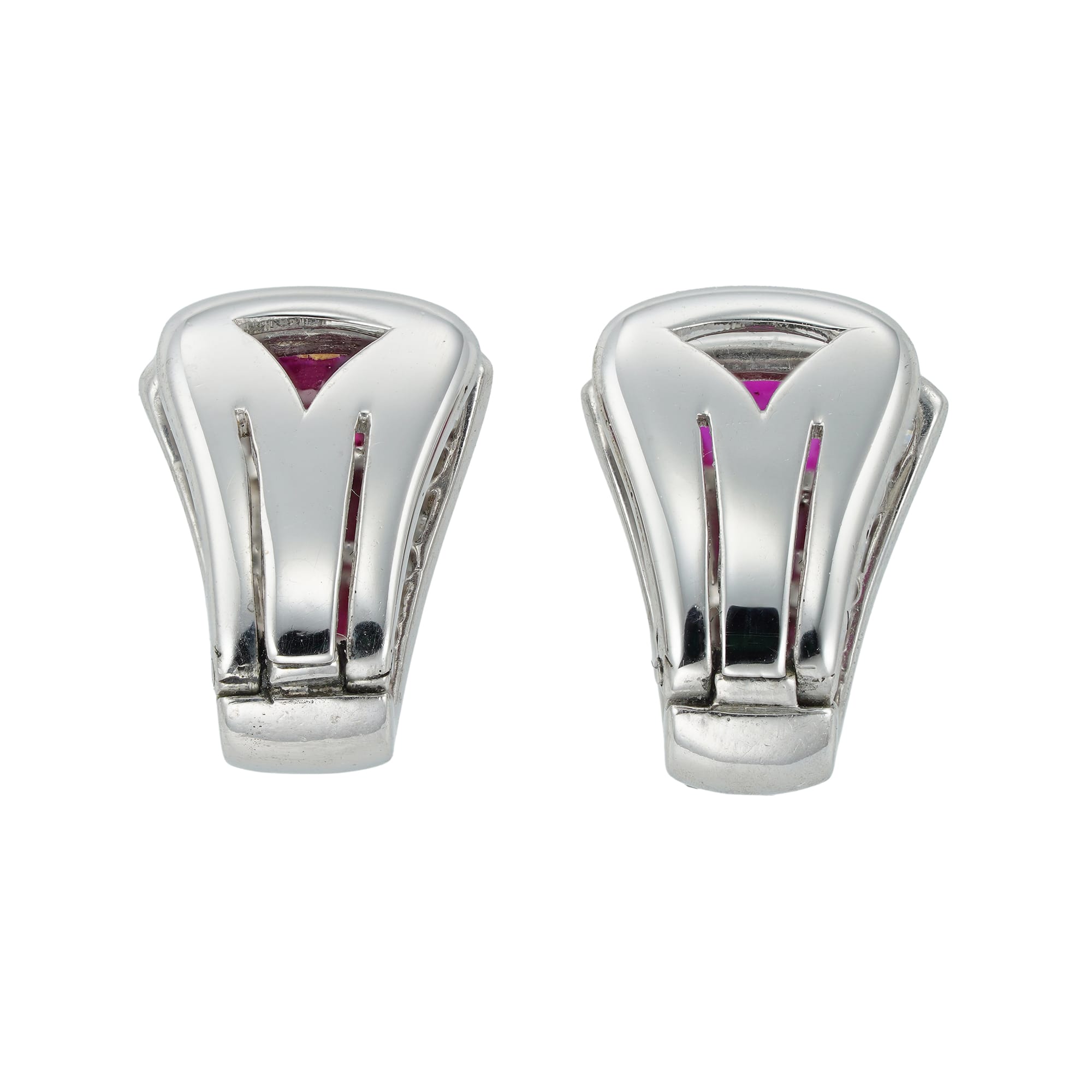 A pair of ruby and diamond clip earrings, each earring centrally-set with four trapeze-cut rubies graduating in size, set between two rows of nine graduating in size swiss-cut diamonds each, the eight rubies estimated to weigh 1.3 carats in total, the swiss-cut diamonds estimated to weigh 0.4 carats in total, all mounted in platinum, to white gold clip fitting, in original fitted case by Longman & Strongitharm, circa 1950, each measuring approximately 1.3 x 0.9cm, gross weight 4.2 grams.