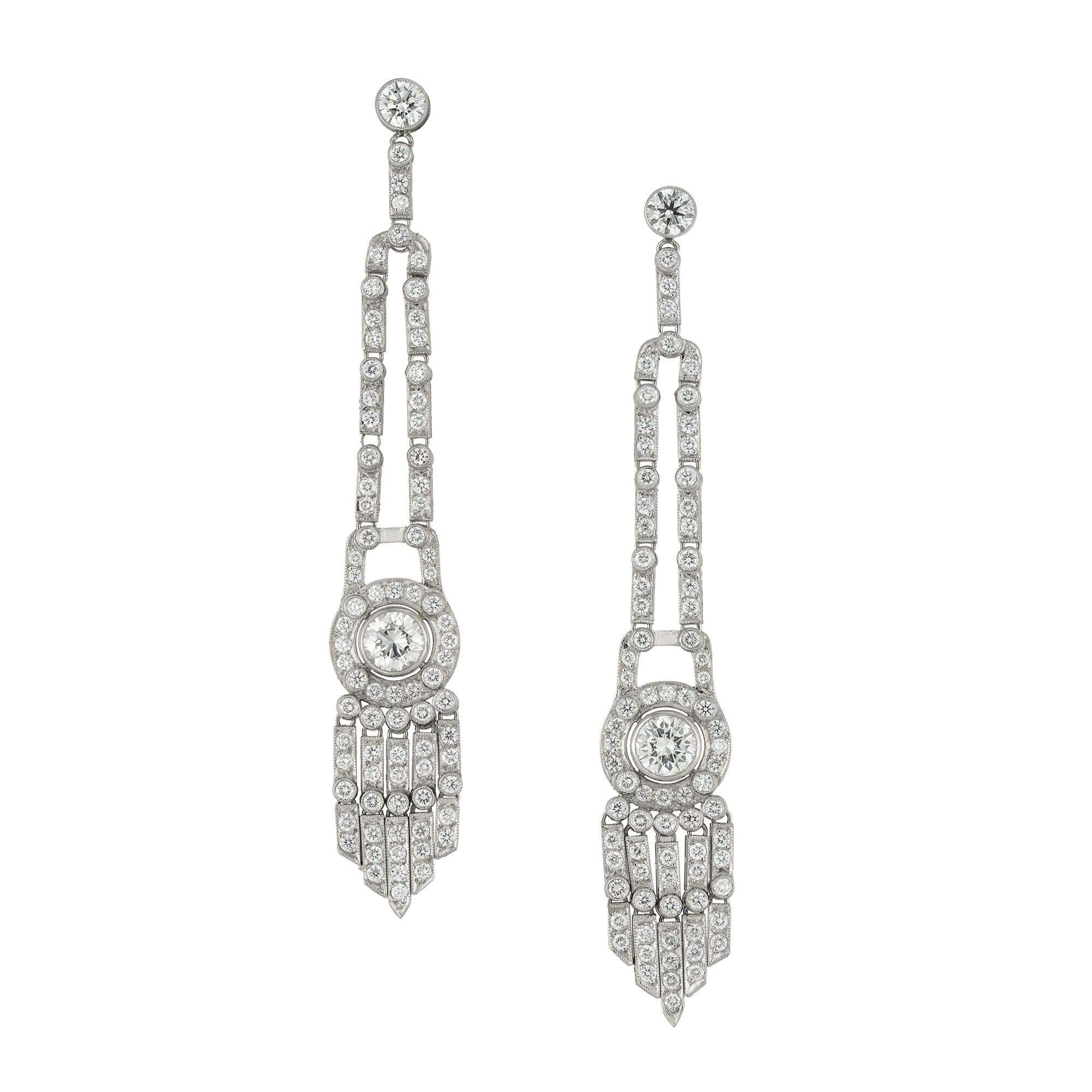 A pair of diamond tassel earrings made by Bentley & Skinner, each set with a round brilliant-cut diamond weighing approximately ½ carat to a diamond-set surround terminating to an articulated diamond-set fringe, the diamonds weighing 3.69 carats in total, all ...