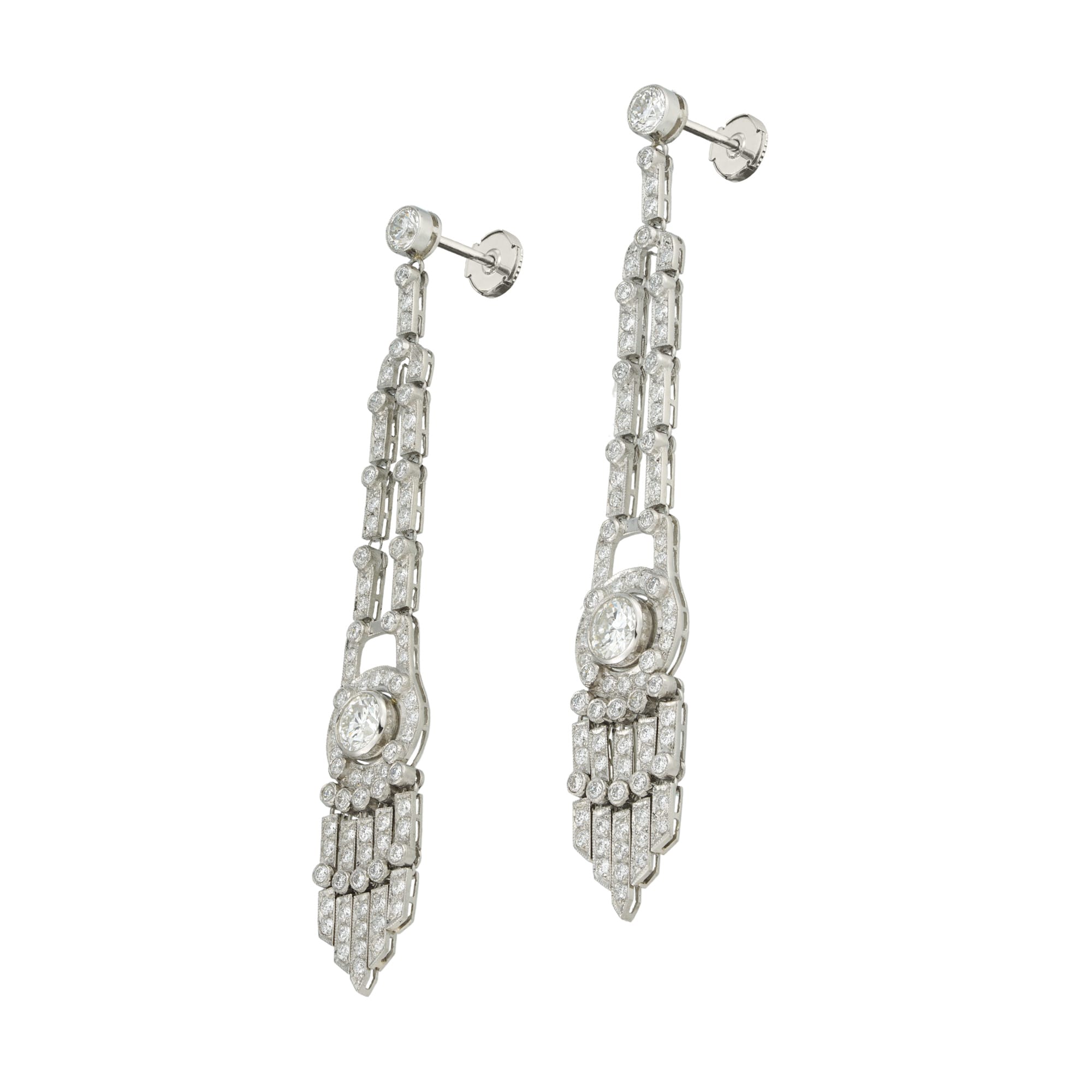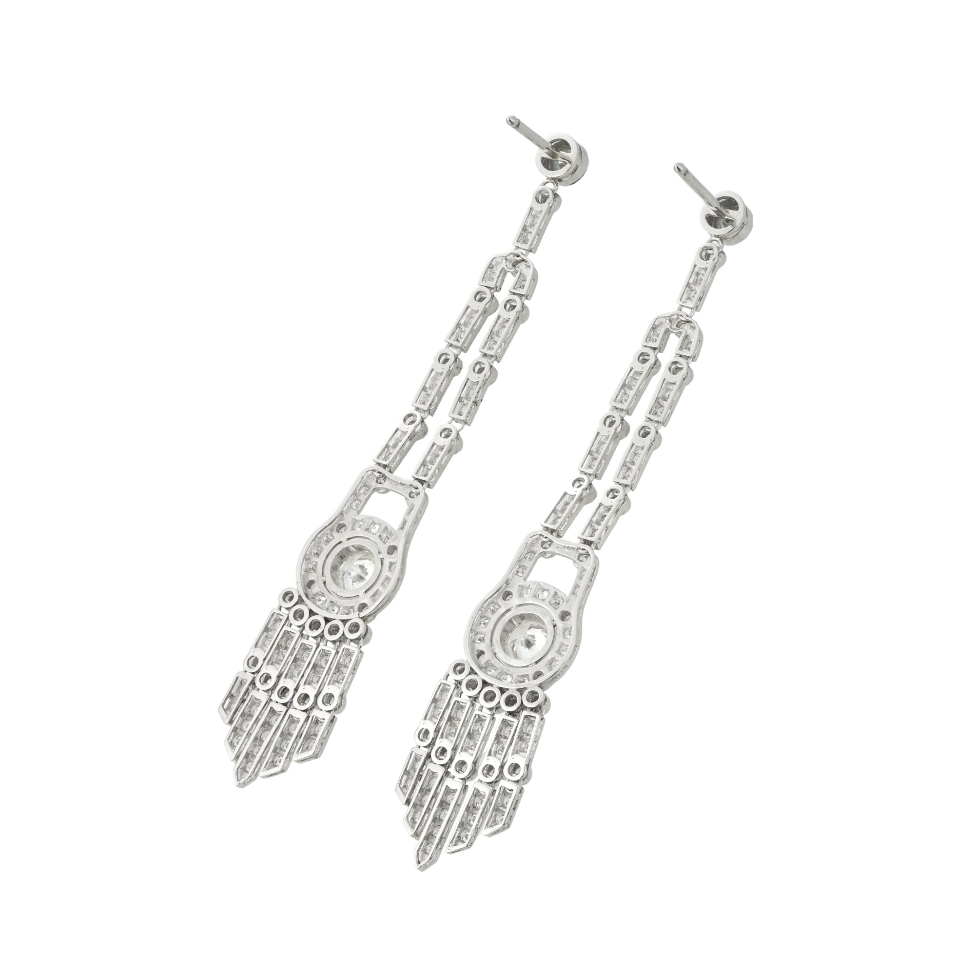 More informationA pair of diamond tassel earrings made by Bentley & Skinner, each set with a round brilliant-cut diamond weighing approximately ½ carat to a diamond-set surround terminating to an articulated diamond-set fringe, the diamonds weighing 3.69 carats in total, all millegrain-set in flexible platinum mounts, with post and alpha-type fittings, hallmarked 950 platinum, London, made by Bentley & Skinner, measuring 7×1.5cm, gross weight 14 grams.