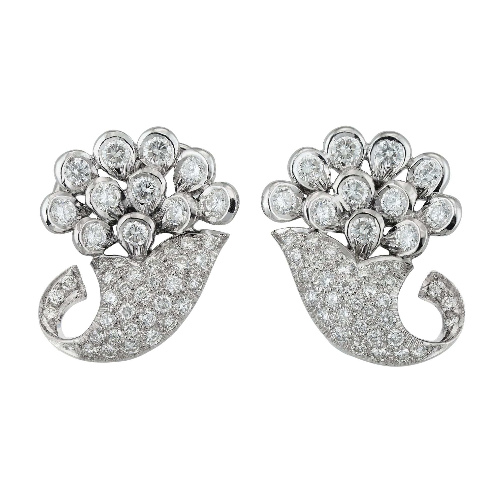 This marvellous pair of diamond-set cornucopia earrings. Each of the beautifully crafted earring takes the shape of a cornucopia, a horn-shape container overflowing with fruits and flowers, symbolizing abundance. To enhance their opulence, the earrings are encrusted in exquisite round brilliant-cut diamonds. Set in white gold to elevate their preciousness, these earrings emanate an allure of timeless glamour and classic elegance.