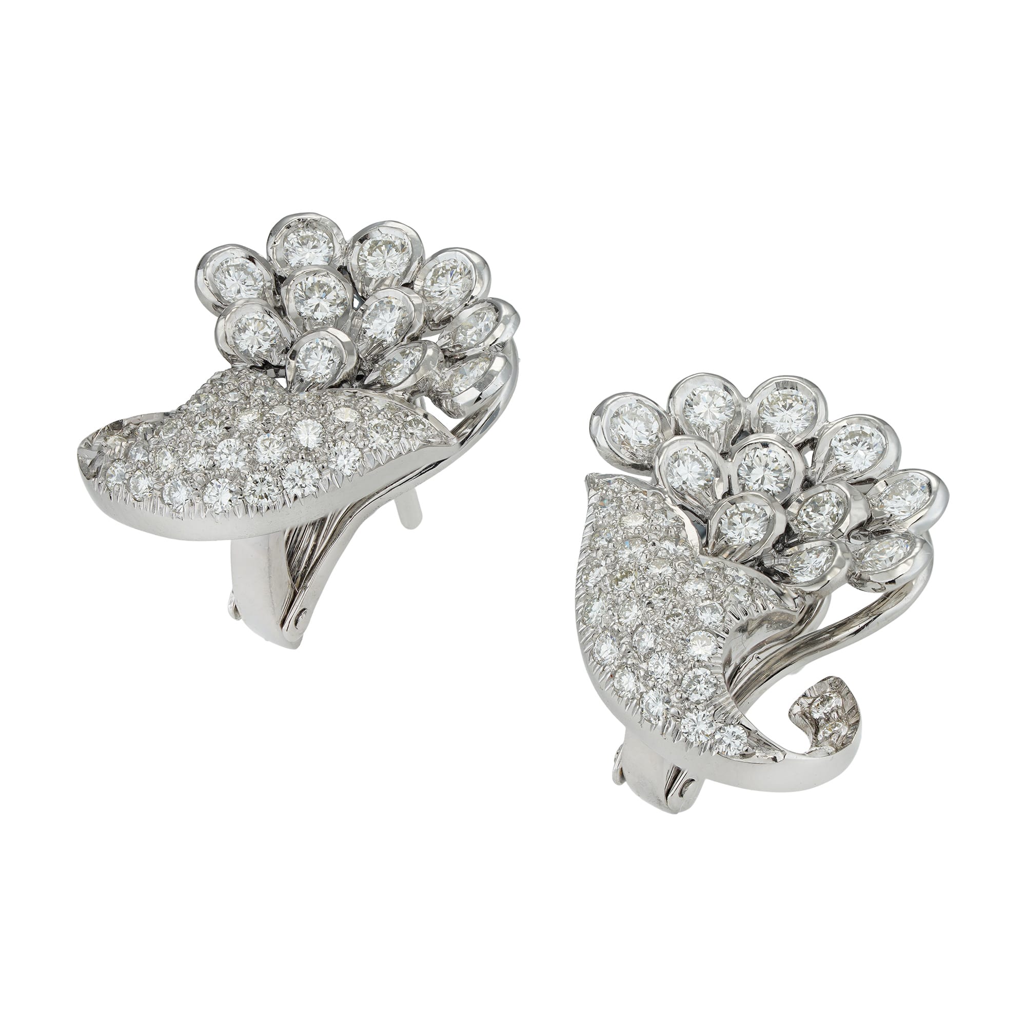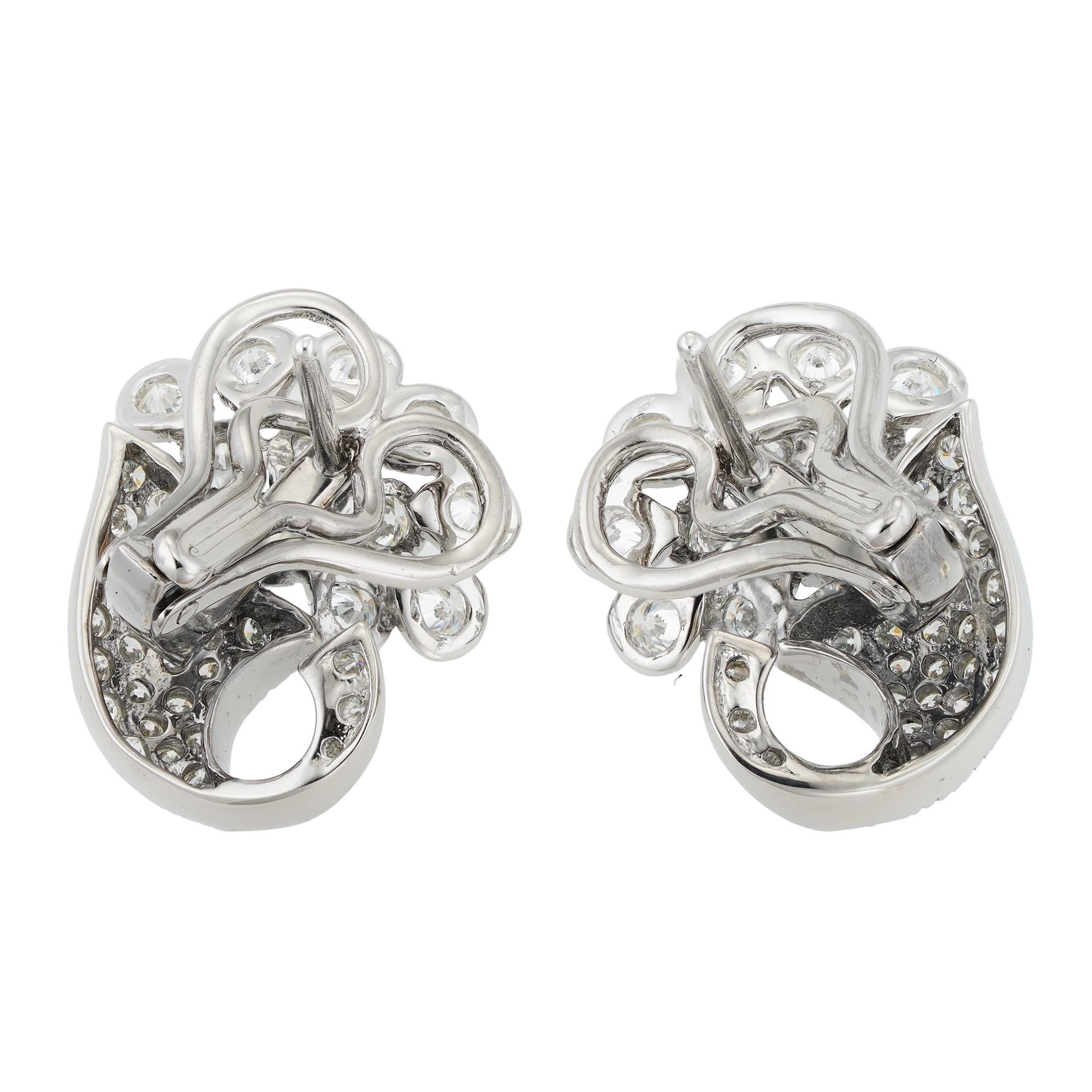 A pair of diamond-set cornucopia earrings, each of a curved design, set with round brilliant-cut diamonds estimated to weigh 3.2 carats in total, all mounted in white gold with clip and post fittings, hallmarked 18ct London 2006, measuring 2.1 x 1.9cm, gross weight 12.3 grams.