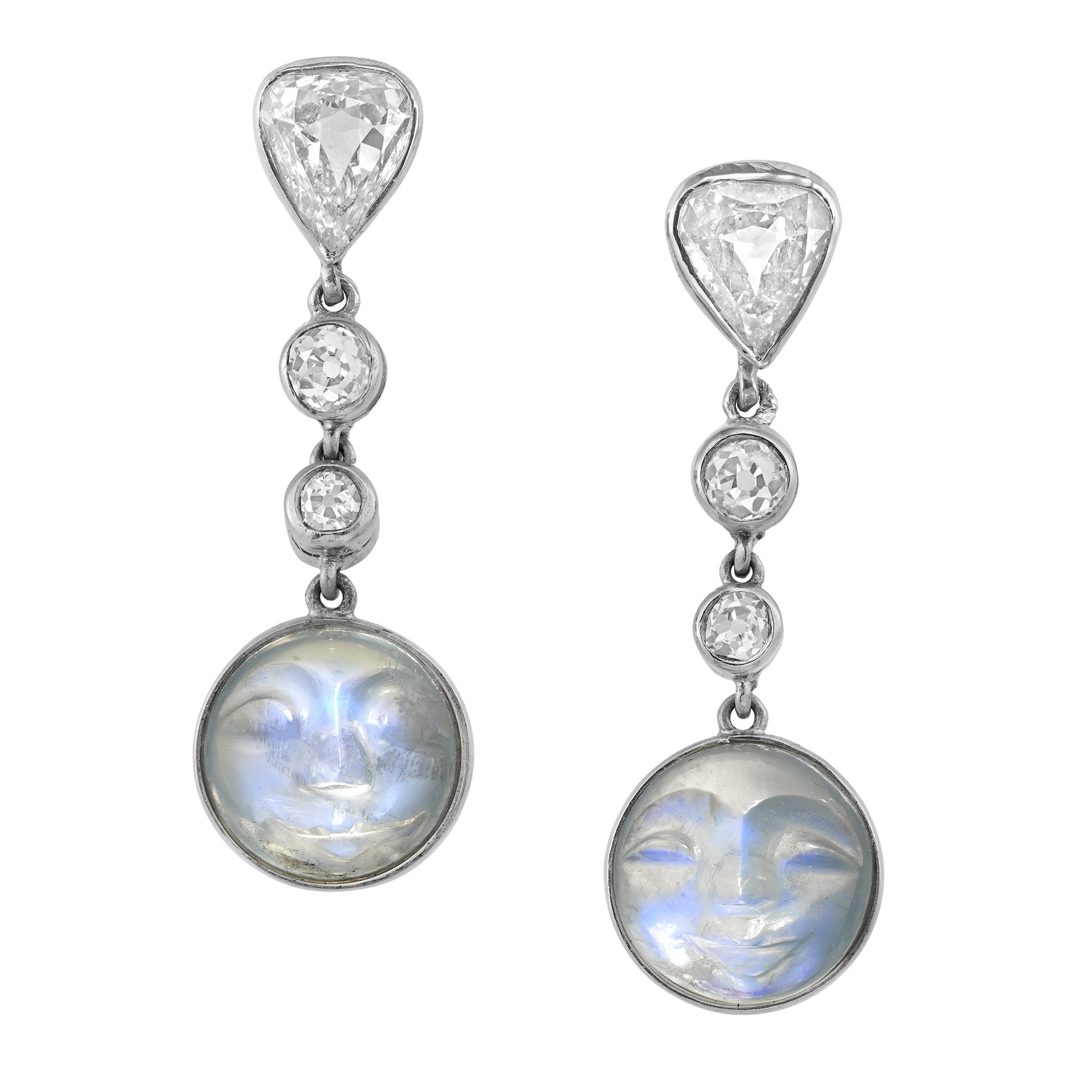 An Edwardian pair of “Man in the moon” drop earrings, each earring with a round cabochon-cut moonstone carved depicting a smiling face, spectacle-set and suspended by two small old European-cut diamonds, all to a rounded triangle-shaped old-cut diamond, diamonds estimated ...