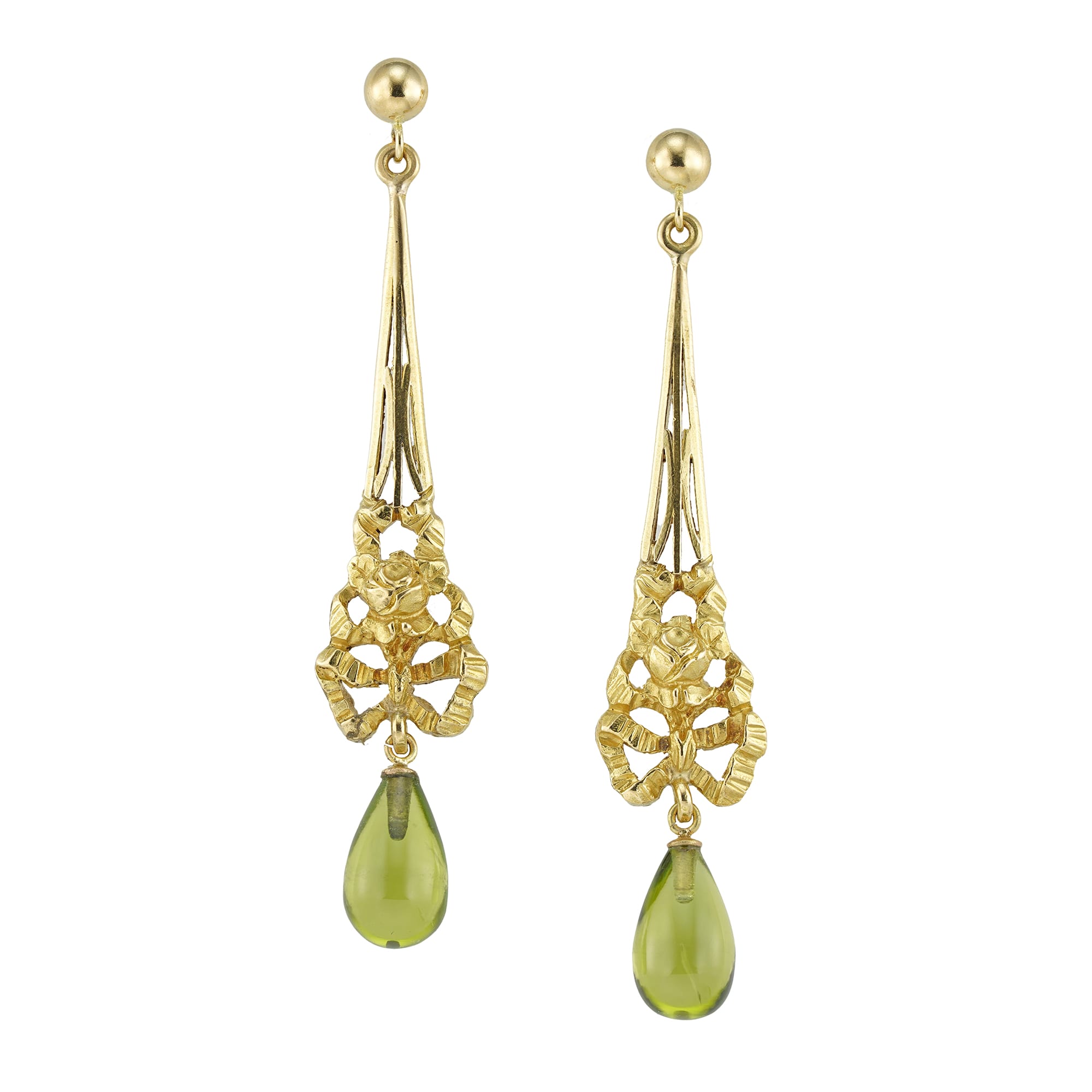 A pair of gold and peridot drop earrings, each earring with a gold spherical top suspending a gold bow and floral motif and terminating to a drop-shaped peridot, the peridots weighing 6.2 carats in total, mounted in gold with post and scroll fittings, hallmarked 18ct gold, London, bearing the Bentley & Skinner sponsormark, measuring 5.2 x 1cm, gross weight 7.7 grams.