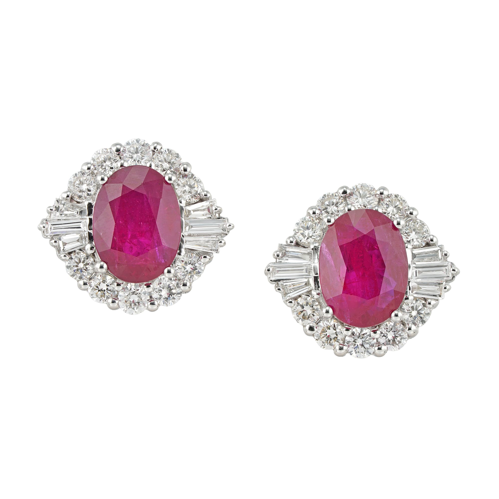 A pair of ruby and diamond cluster earrings, each earring centrally-set with an oval faceted ruby, the rubies weighing 2.96 carats in total for the pair, each surrounded by a frame formed by six baguette-cut and ten round brilliant-cut diamonds ...
