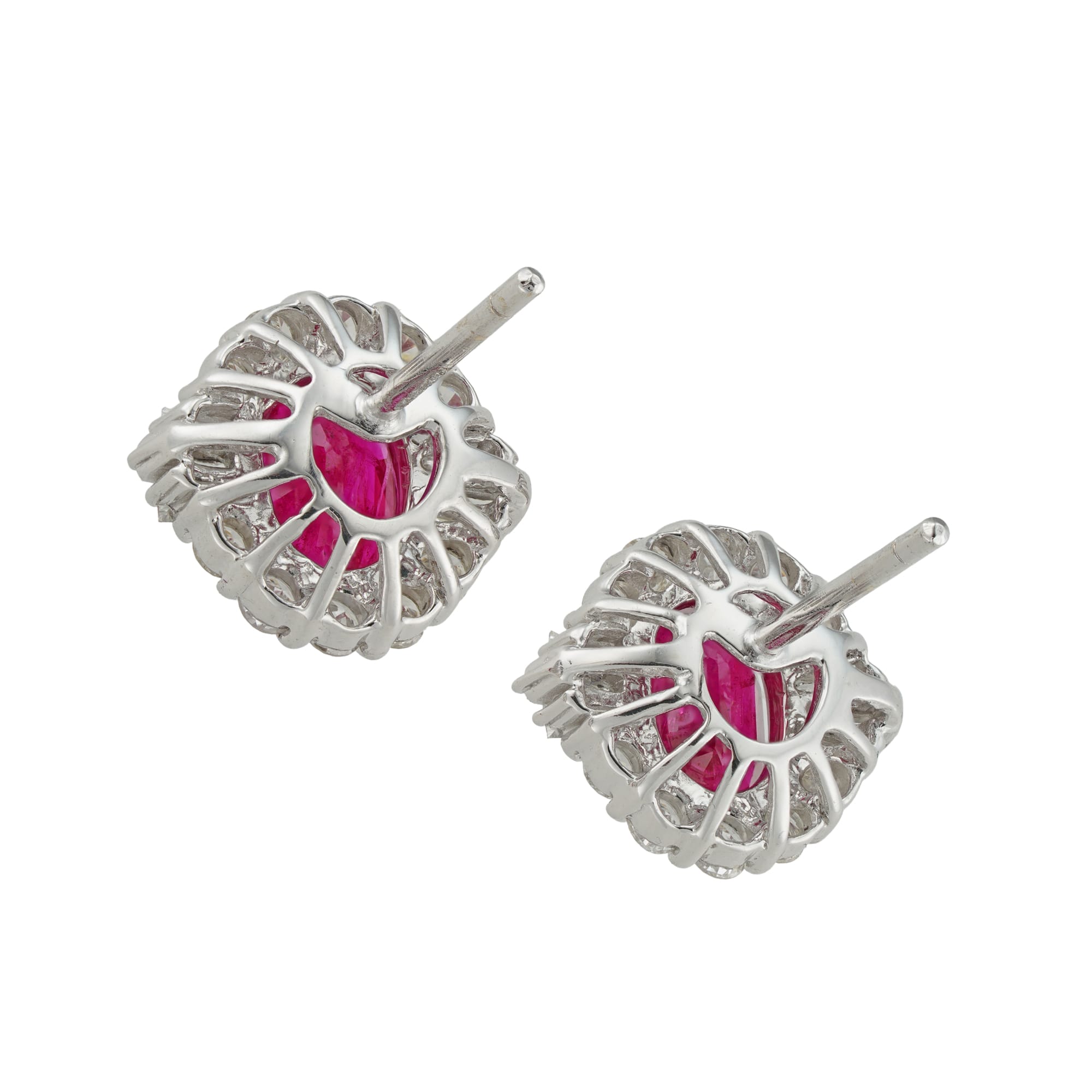 A pair of ruby and diamond cluster earrings, each earring centrally-set with an oval faceted ruby, the rubies weighing 2.96 carats in total for the pair, each surrounded by a frame formed by six baguette-cut and ten round brilliant-cut diamonds estimated to weigh a total of 1 ½ carats for the pair, all claw-set in white gold mount with post and scroll fittings, hallmarked 18ct gold, London, 2022, bearing the Bentley & Skinner sponsormark, measuring 1.4 x 1.2cm, gross weight 5.2 grams.
