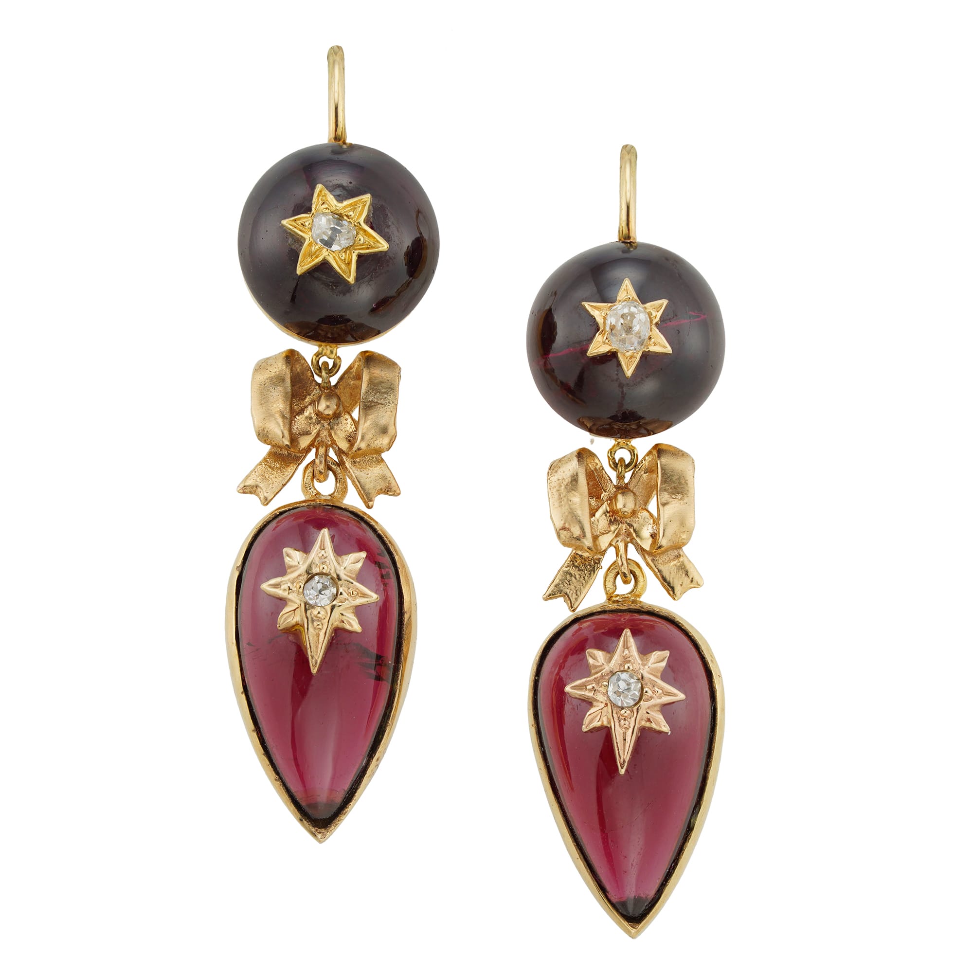 A charming pair of Victorian garnet and diamond drop earrings. The earrings showcase a charming design: a round garnet adorned with a delicate diamond and gold star, below a deep red pear-shaped garnet embellished with the same intricate design. Connecting these resplendent gems is a fine, graceful winked with a gold bow, all meticulously mounted in gold. Dating back to circa 1880, these earrings exude an aura of timeless elegance and charm.