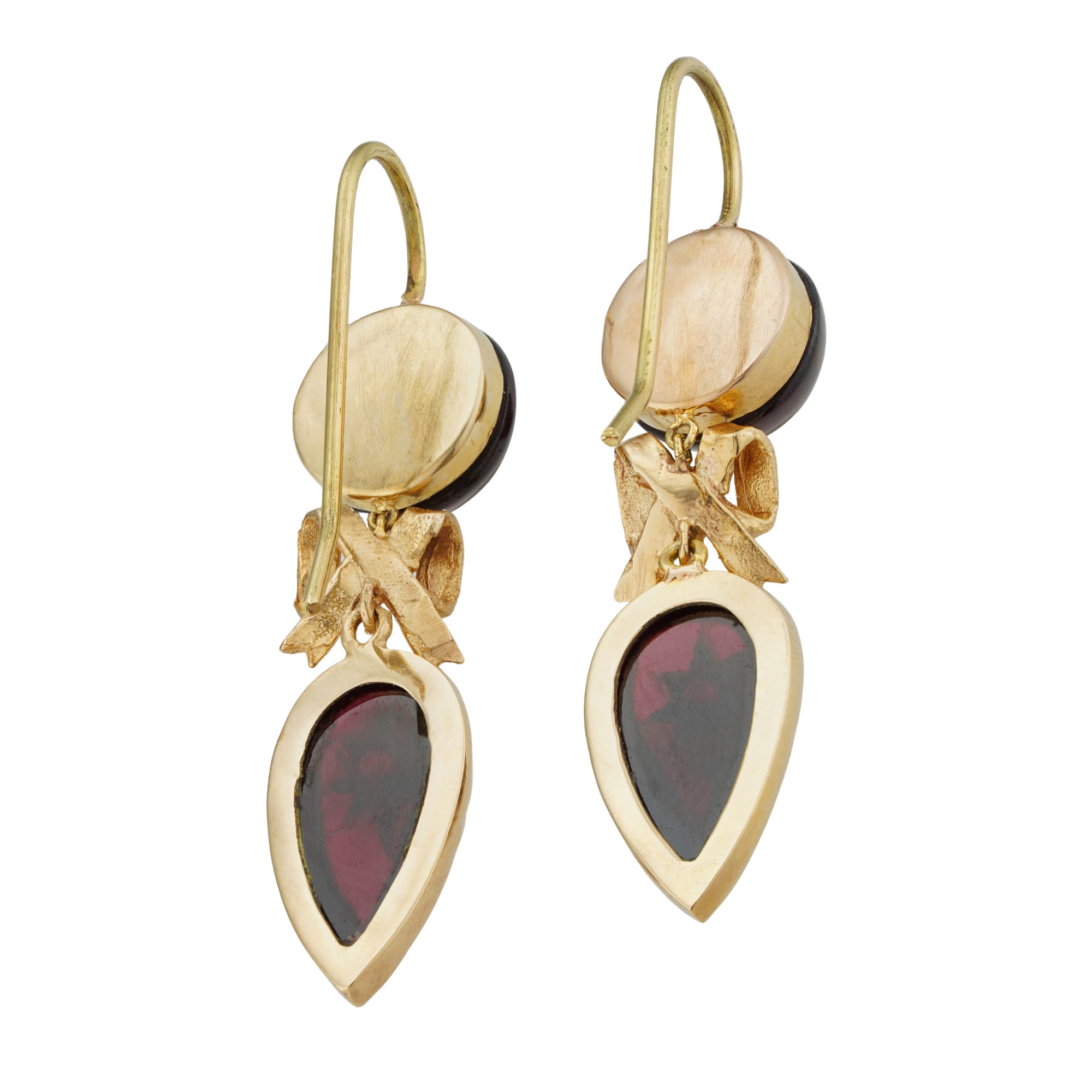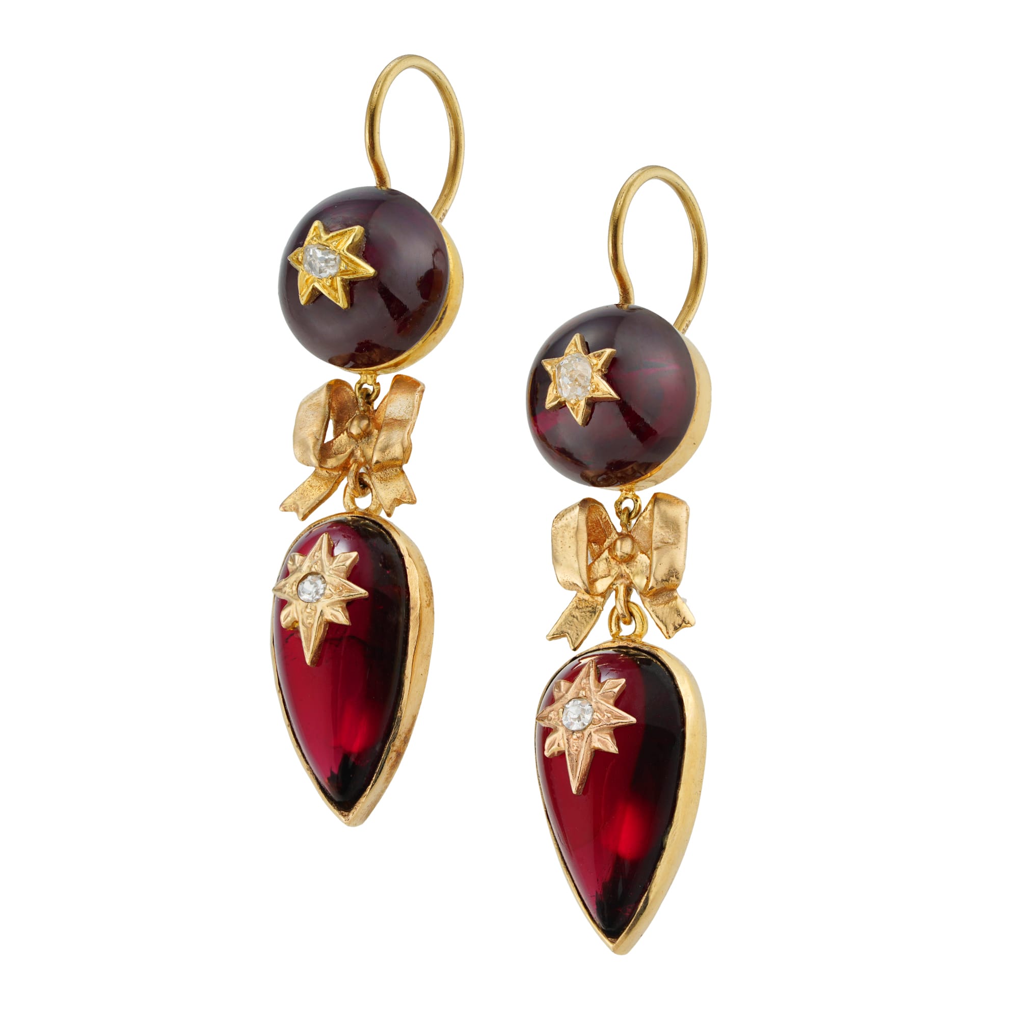 More informationA pair of Victorian garnet and diamond drop earrings, each earring consisting of a pear-shaped cabochon garnet measuring approximately 14 x 8mm and applied with an old-cut diamond-set star, rubover-set in a gold collet and suspended from a smaller round garnet top of same design winked with a gold bow, all mounted in gold with hook wire fittings, circa 1880, measuring approximately 3.7 x 0.9cm, gross weight 6.2 grams.