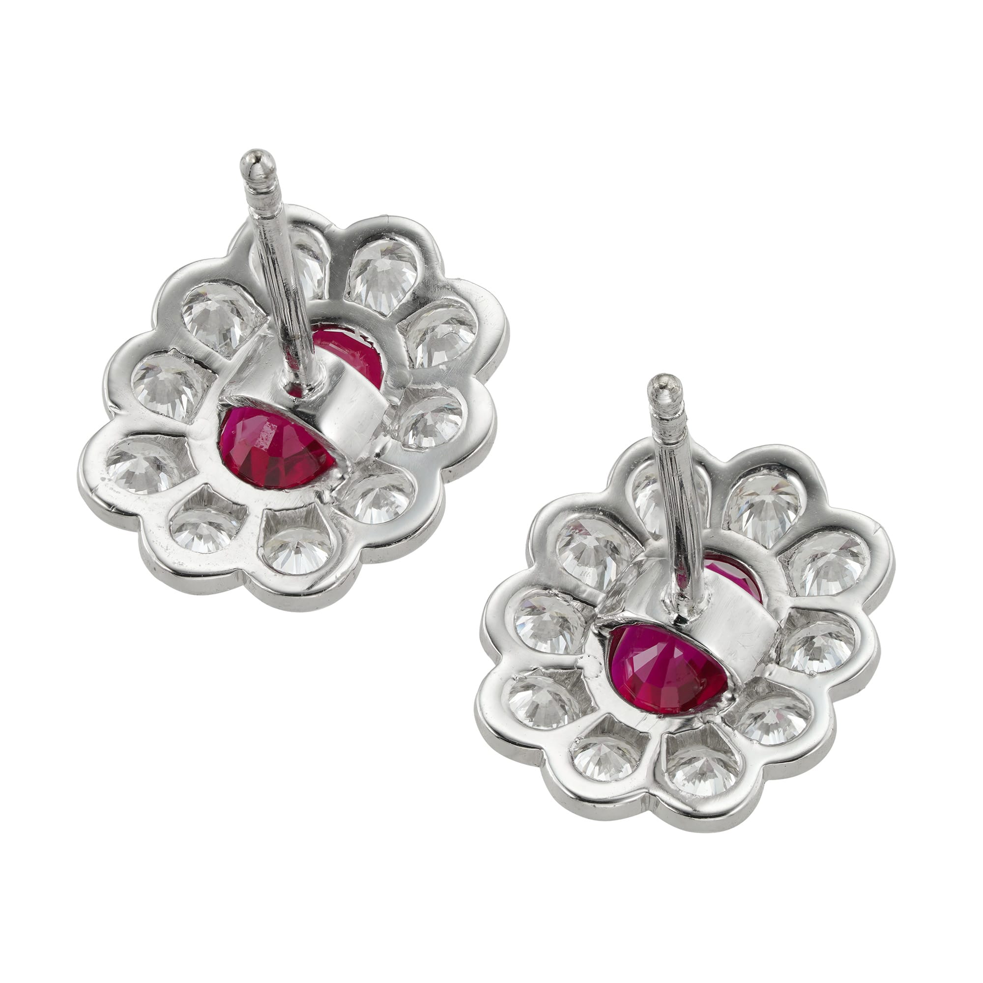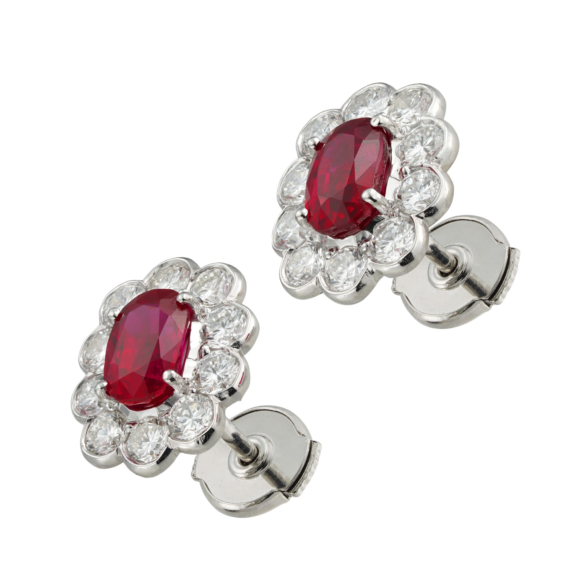 A pair of ruby and diamond cluster earrings, each earring set with a cushion-cut ruby, the one weighing 1.10 carats and the other weighing 1.02 carats accompanied by GCS report stating to be of Burmese origin, each four-claw set and surrounded by ten round brilliant-cut diamonds in rubover setting, the diamonds estimated to weigh 1½ carats in total for the pair, mounted in white gold mounts with post and alpha-type fittings, circa 1960, later hallmarked 18ct gold, London, 2023, bearing the Bentley & Skinner sponsormark, measuring 1.3 x 1.1cm, gross weight 3.5 grams.