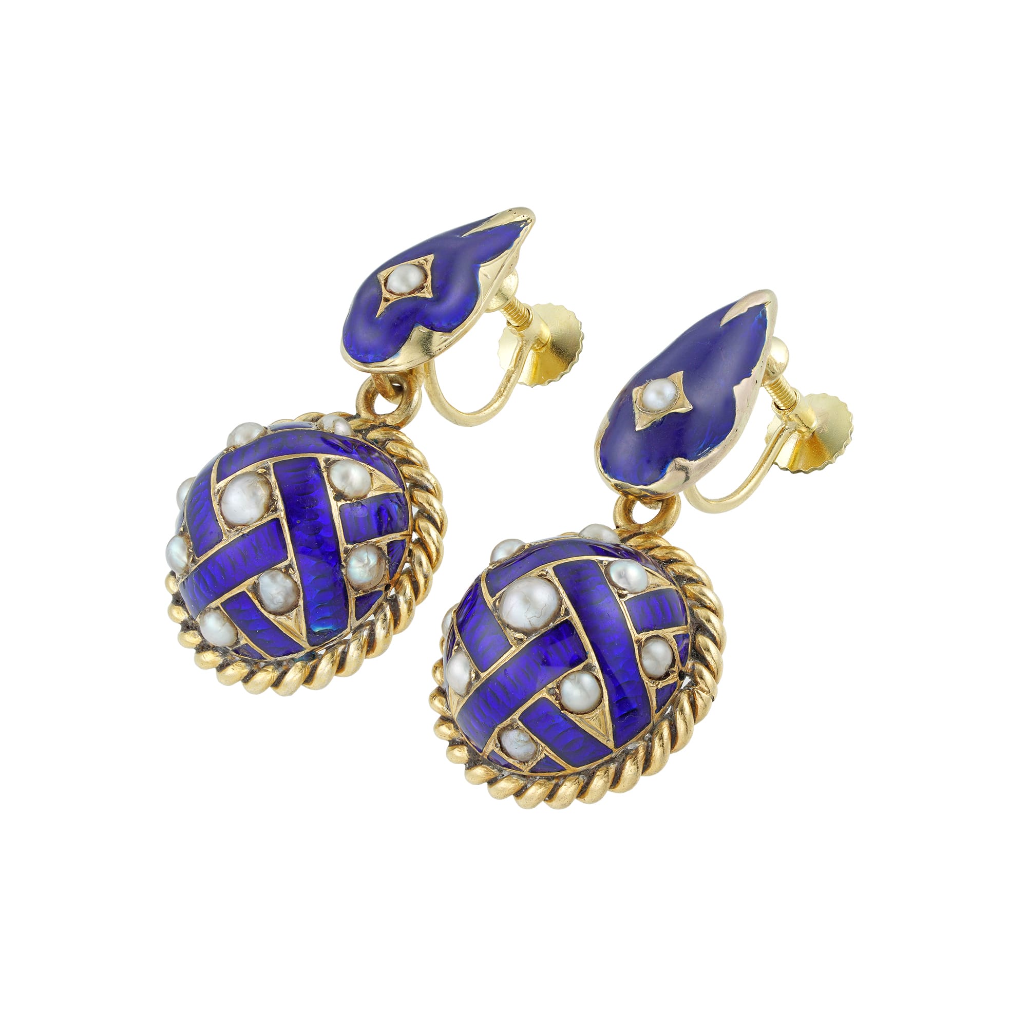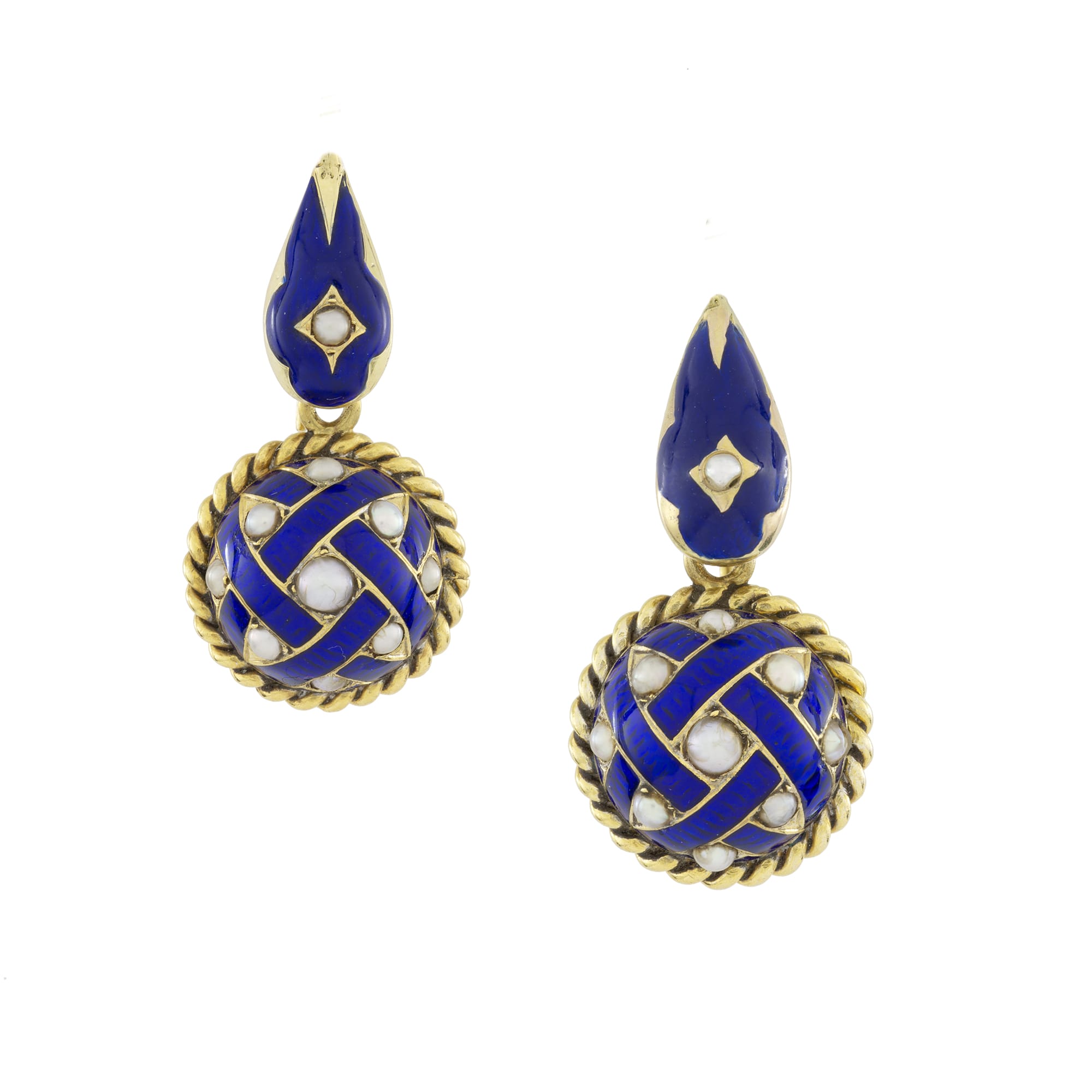 A pair of Victorian blue enamel and pearl drop earrings, each consisting of a round dome with blue enamel basket weave pattern decoration, set with nine half-pearls in between, surrounded by a twisted gold rope frame and suspended by a ...
