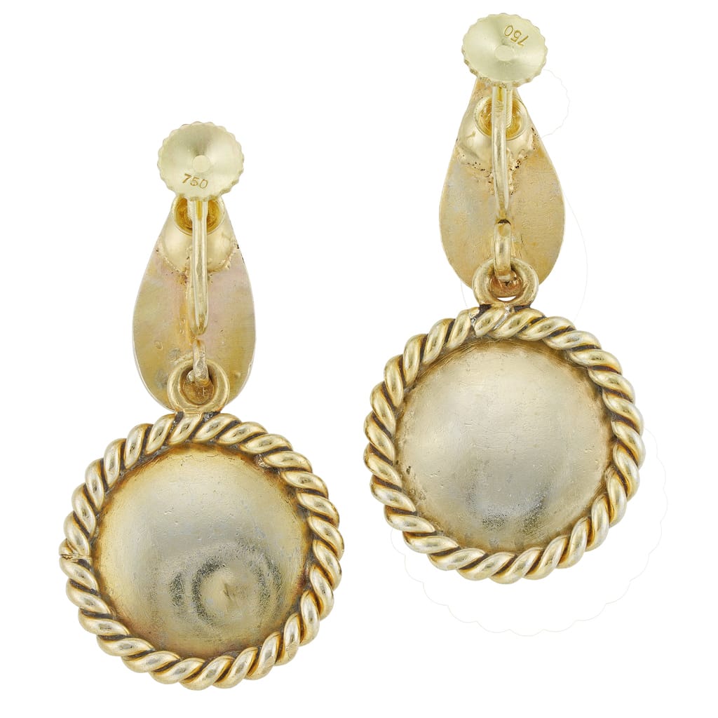 More informationA pair of Victorian blue enamel and pearl drop earrings, each consisting of a round dome with blue enamel basket weave pattern decoration, set with nine half-pearls in between, surrounded by a twisted gold rope frame and suspended by a pear-shaped top with blew enamel decoration set with one half-pearl, all mounted in yellow gold with gold scroll-back fittings, circa 1860, measuring approximately 3×1.5cm, gross weight 8.3 grams.