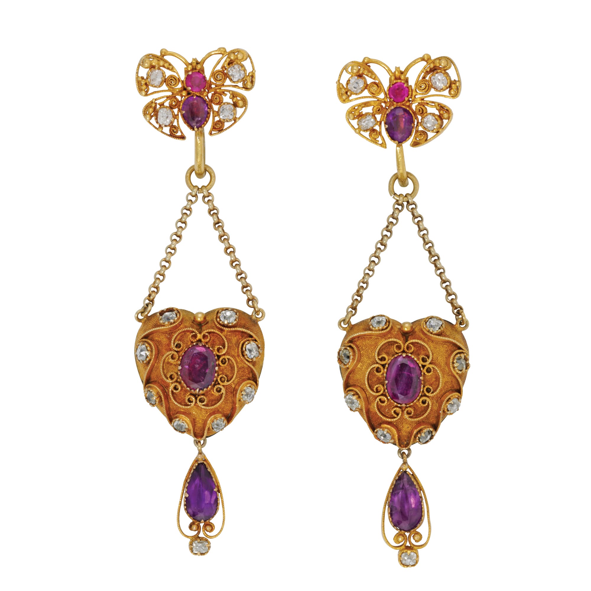 More informationA pair of Regency gold and gem-set drop earrings, each textured gold heart set to the centre with an oval faceted ruby within eight small old cut diamonds estimated to weigh a total of 0.30 carats, further decorated with scroll cannetille details, suspending a pear-shaped amethyst and old-cut diamond drop, each heart attached to two chains, terminating to a gold butterfly top, embellished with a round faceted ruby, an oval amethyst, old-cut diamonds, with cannetille and granulation details, all set in yellow gold mount with later screw back fittings, circa 1820, each earring measuring 6 x 1.5 cm, gross weight 8.1 grams.