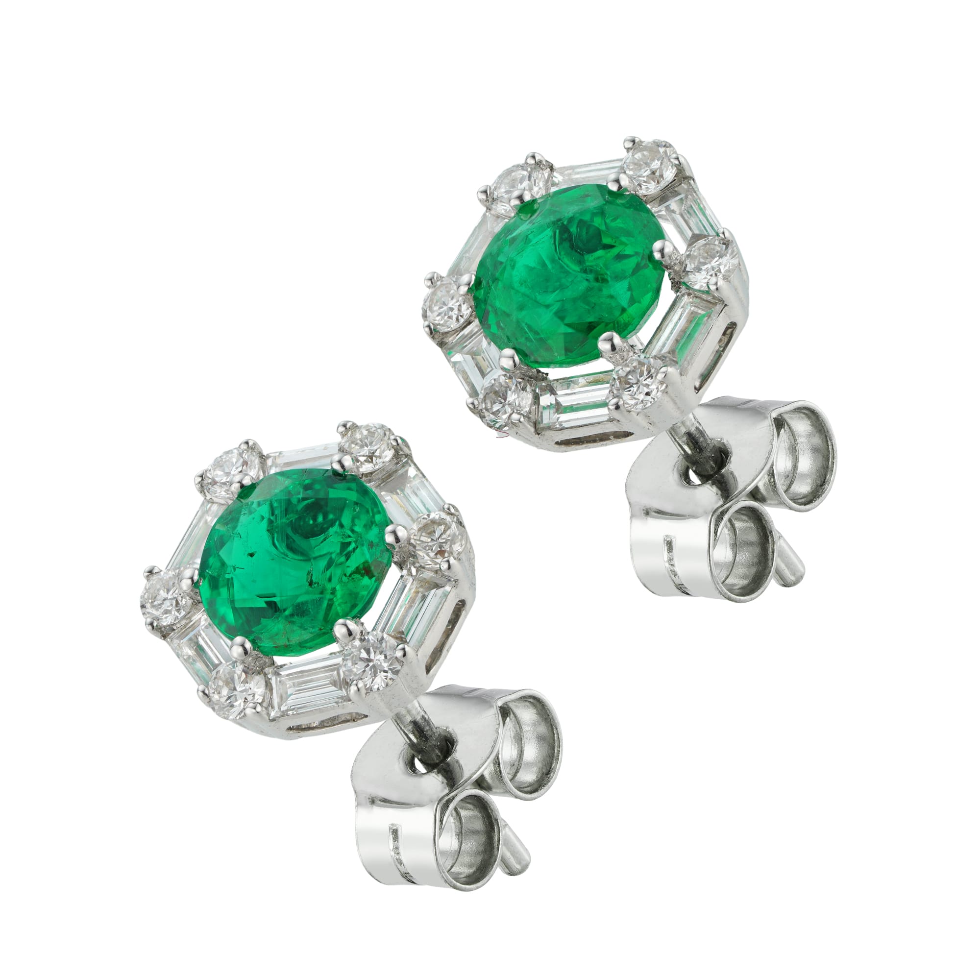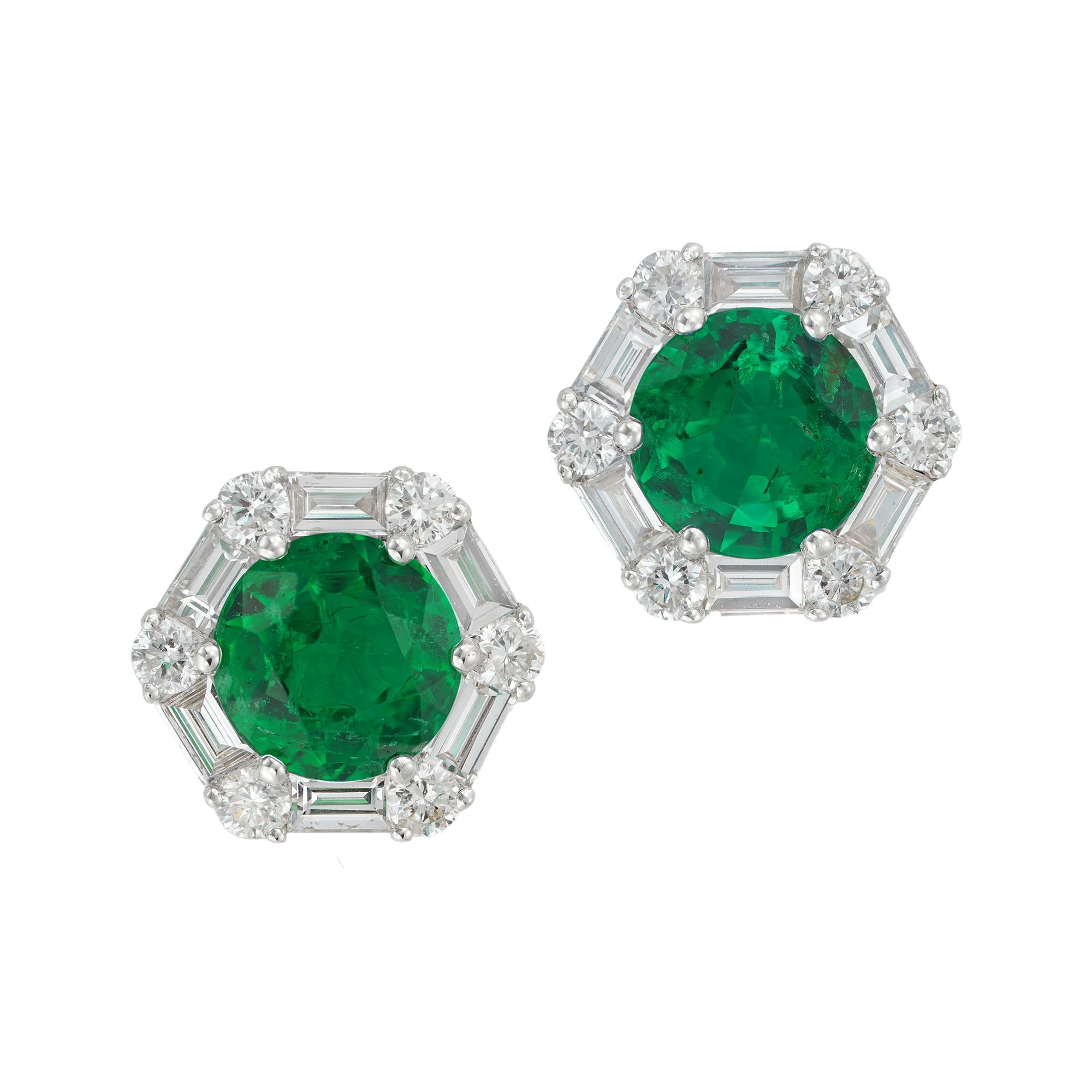A pair of emerald and diamond hexagonal cluster earrings, the two round faceted emeralds weighing 0.79 carats in total, each surrounded by a hexagonal-shaped frame set with six round brilliant cut diamonds, one on each corner, and six baguette cut ...
