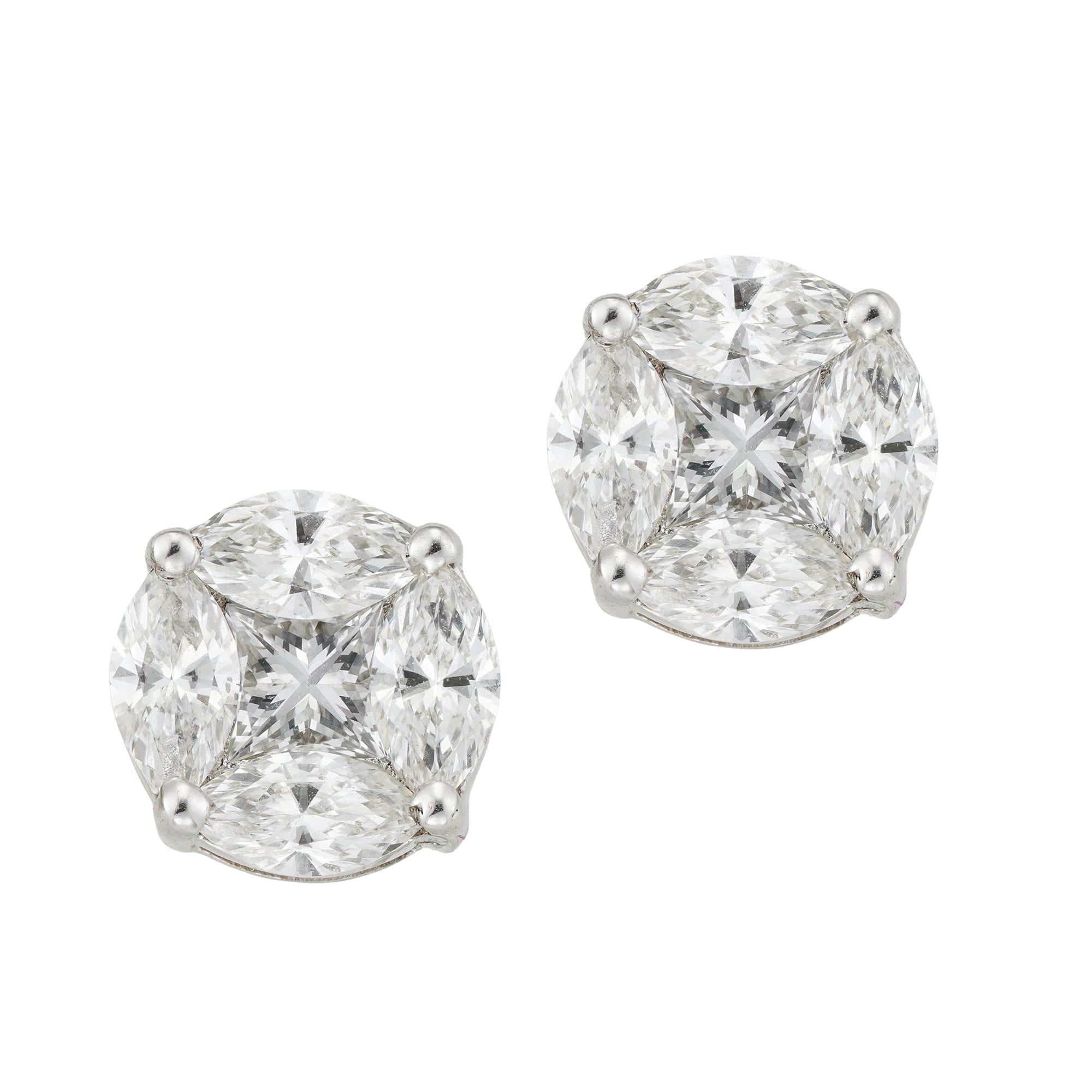 A pair of diamond-set cluster earrings, the round panel centred with a princess cut diamond surrounded by four marquise diamonds weighing a total of 1.20 carats, all set in white gold mount, with post and scroll fitting, measuring approximately 7.02mm ...