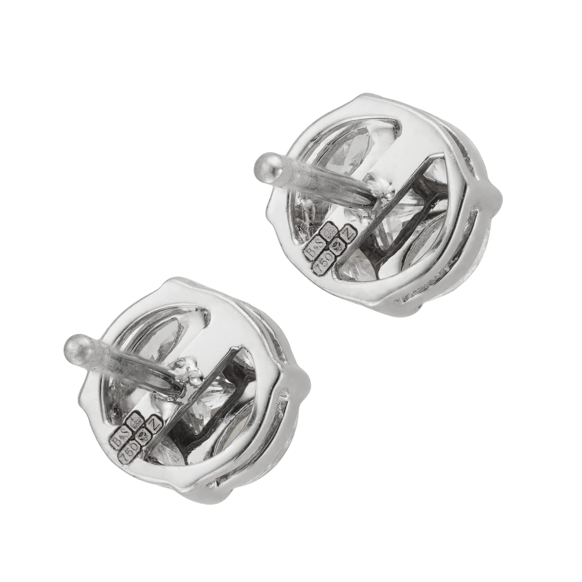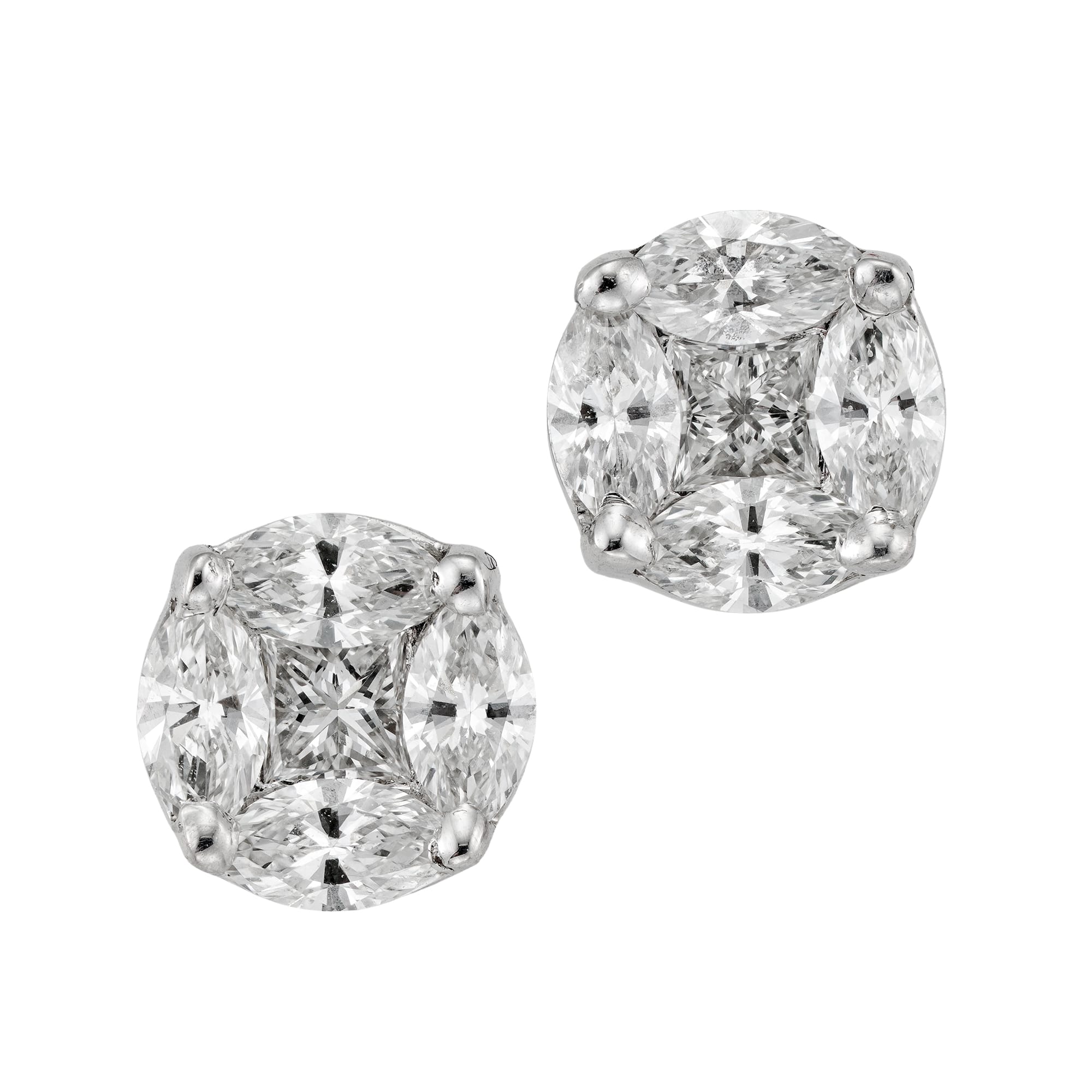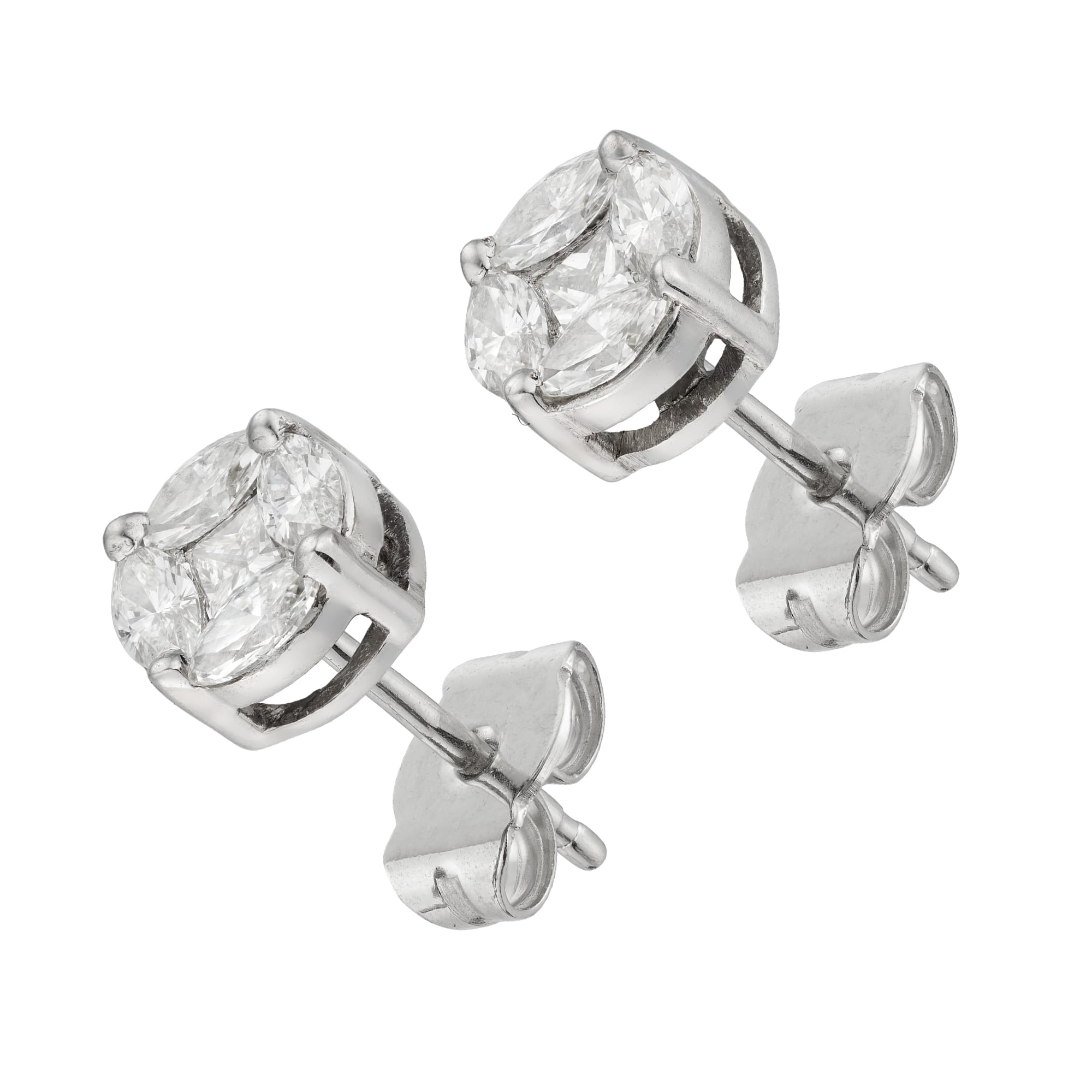 More informationA pair of diamond-set cluster earrings, the round panel centred with a princess cut diamond surrounded by four marquise diamonds weighing a total of 0.65 carats, all set in white gold mount, with post and scroll fitting, measuring approximately 0.5mm in diameter, hallmarked 18ct gold London, 2024, bearing the Bentley & Skinner sponsor mark, gross weight 1.9 grams.