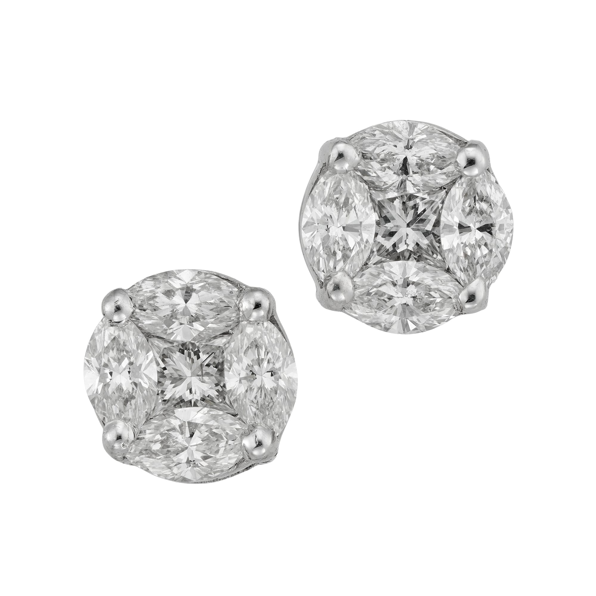 More informationA pair of diamond-set cluster earrings, the round panel centred with a princess cut diamond surrounded by four marquise diamonds weighing a total of 1.10 carats, all set in white gold mount, with post and scroll fitting, measuring approximately 0.7mm in diameter, hallmarked 18ct gold London, 2024, bearing the Bentley & Skinner sponsor mark, gross weight 1.9 grams.