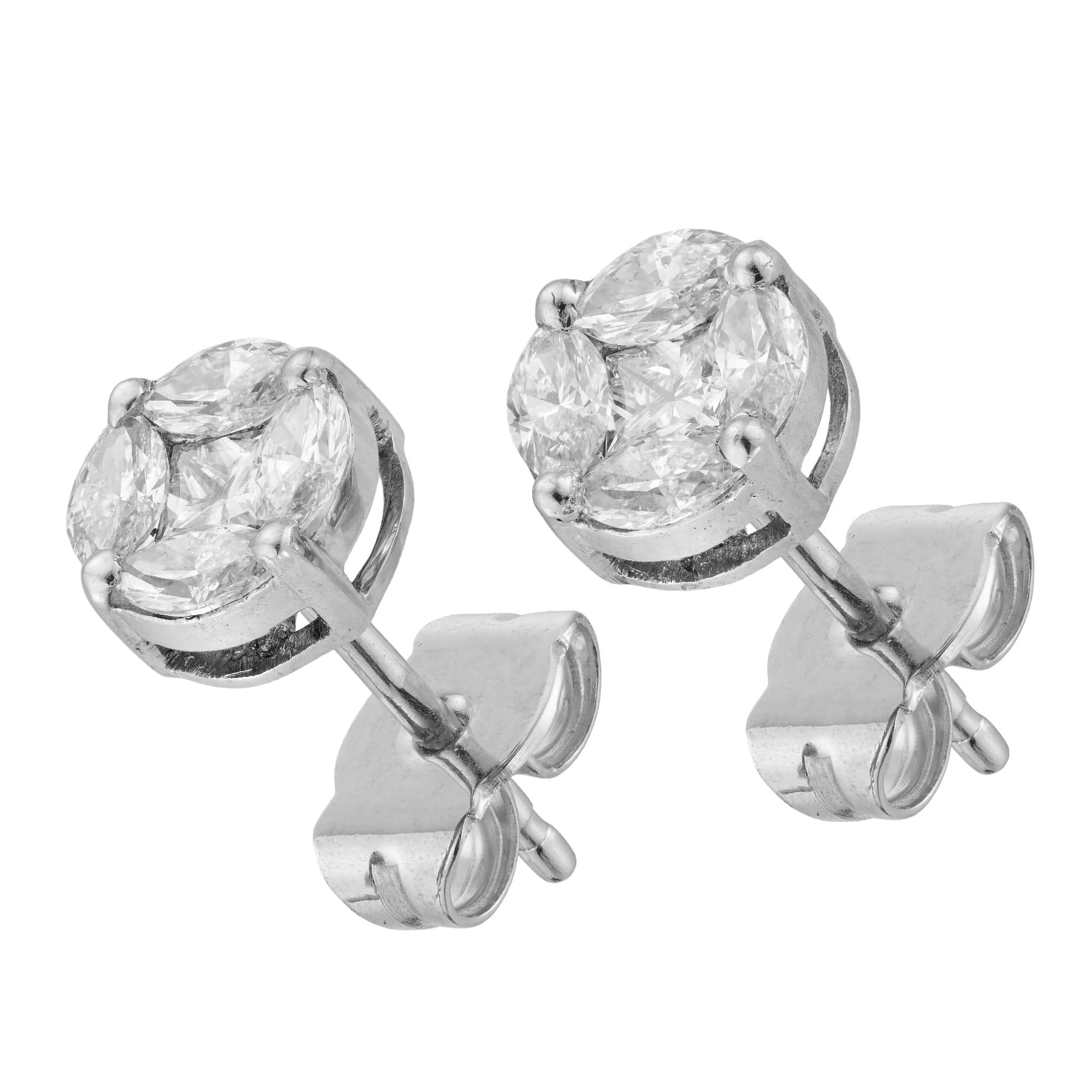 A pair of diamond-set cluster earrings, the round panel centred with a princess cut diamond surrounded by four marquise diamonds weighing a total of 1.10 carats, all set in white gold mount, with post and scroll fitting, measuring approximately 0.7mm ...