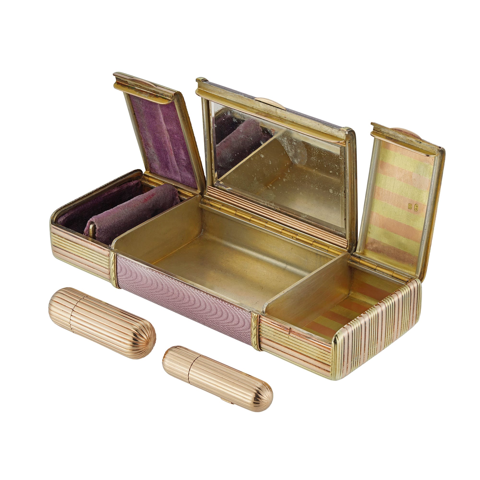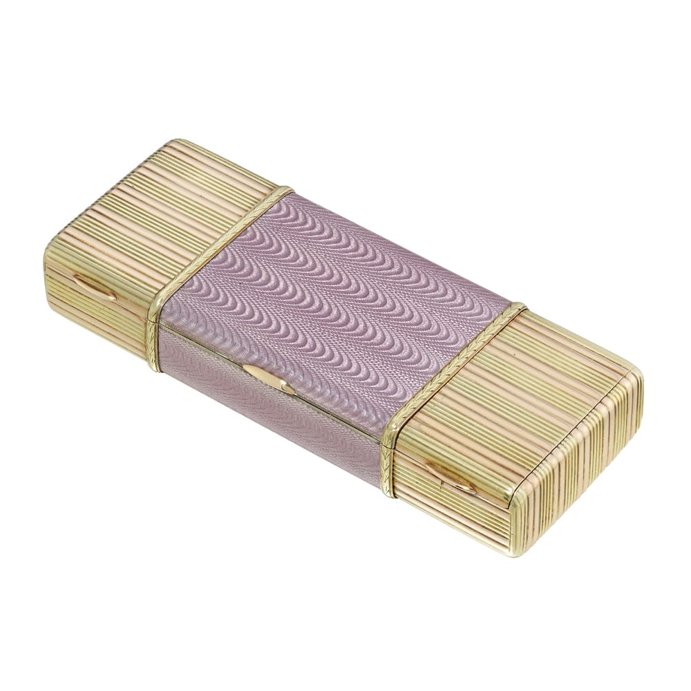 More informationA Fabergé two-colour gold and lilac enamel vanity case by Workmaster Albert Holmstrom, the rectangular case measuring approximately 11cms in width, the central powder compartment decorated with translucent lilac enamel upon a wave design guilloché ground within a chased gold laurel leaf border, hinged lid with mirror, all flanked by two further compartments in reeded pink and yellow gold, one lined with matching lilac plush with two fitted reeded lip rouge cases, St Petersburg, 1908 – 1917.