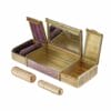 A wonderful Fabergé vanity case. Created from gold with lilac enamel, this sweet and feminine vanity case opens to reveal a mirror and two small compartments, one which holds two lipstick cases. The house of Fabergé was established in St Petersburg in 1842, and by the lats nineteenth century, was Russia’s largest and most well-known jewellery house. . This piece bears the marks for Fabergé workmaster Albert Holstrom, son of Fabergé workmaster August Holmstron. During the early twentieth century, Fabergé was known for creating not only jewellery, but small decorative and useful objets d’art, the most famous being the easter eggs created for the Russian Imperial Family. The lilac enamel pairs beautifully with the bright gold of this case, making this both a luxurious and wonderfully useful object.
