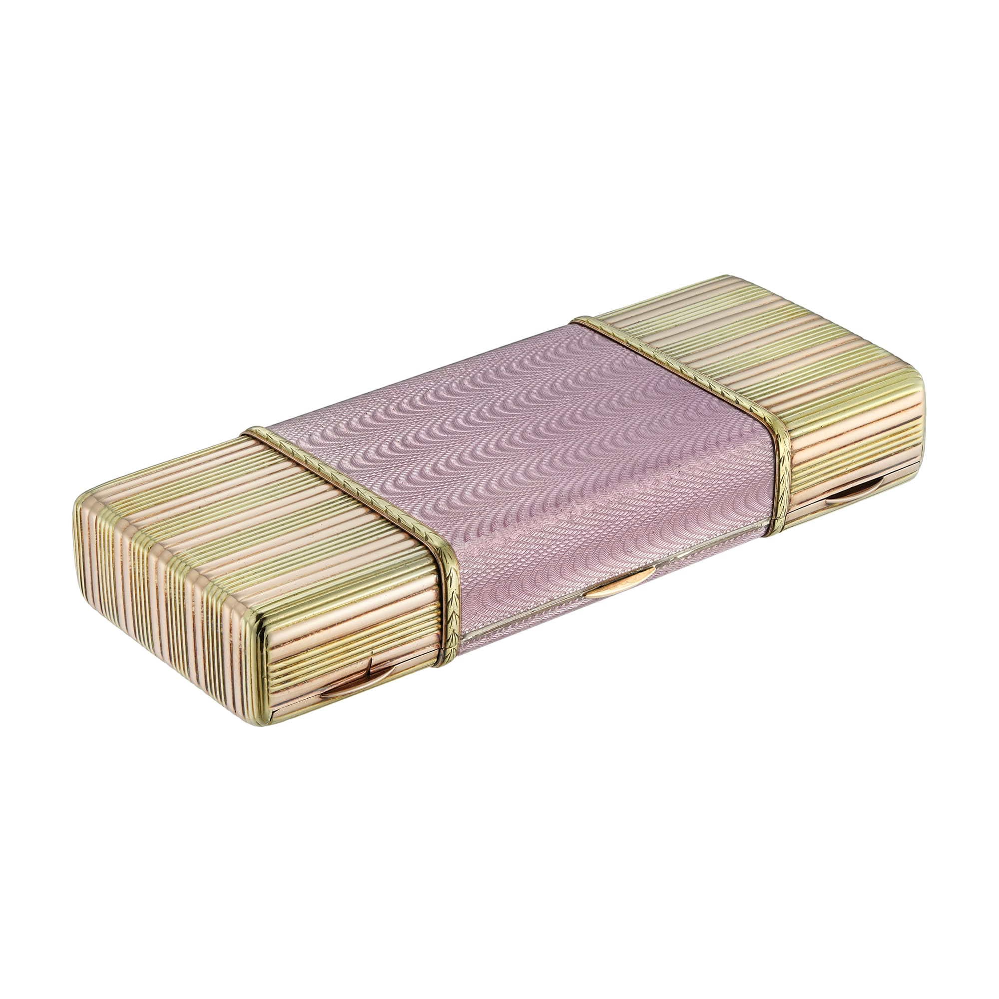 A Fabergé two-colour gold and lilac enamel vanity case by Workmaster Albert Holmstrom, the rectangular case measuring approximately 11cms in width, the central powder compartment decorated with translucent lilac enamel upon a wave design guilloché ground within a chased gold ...