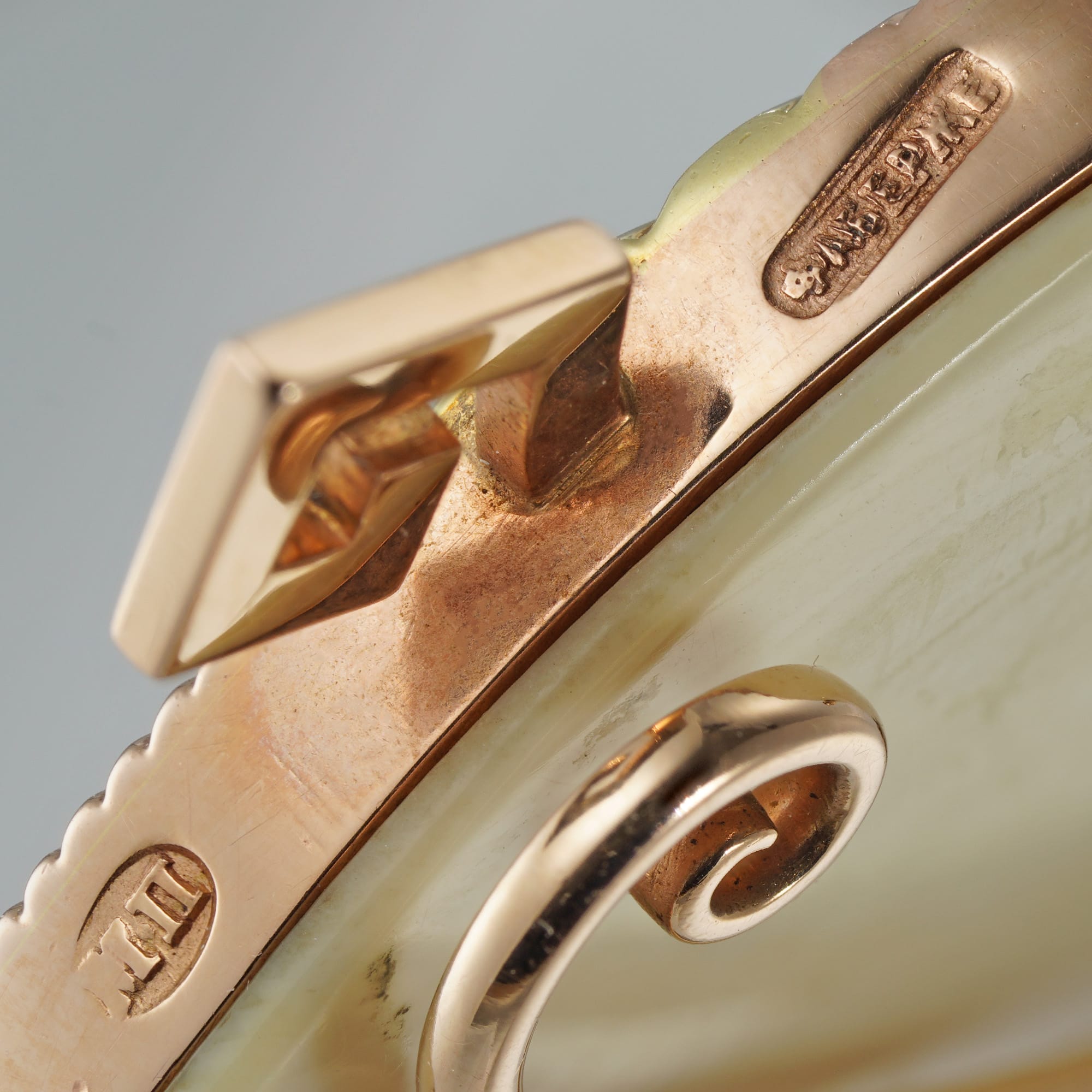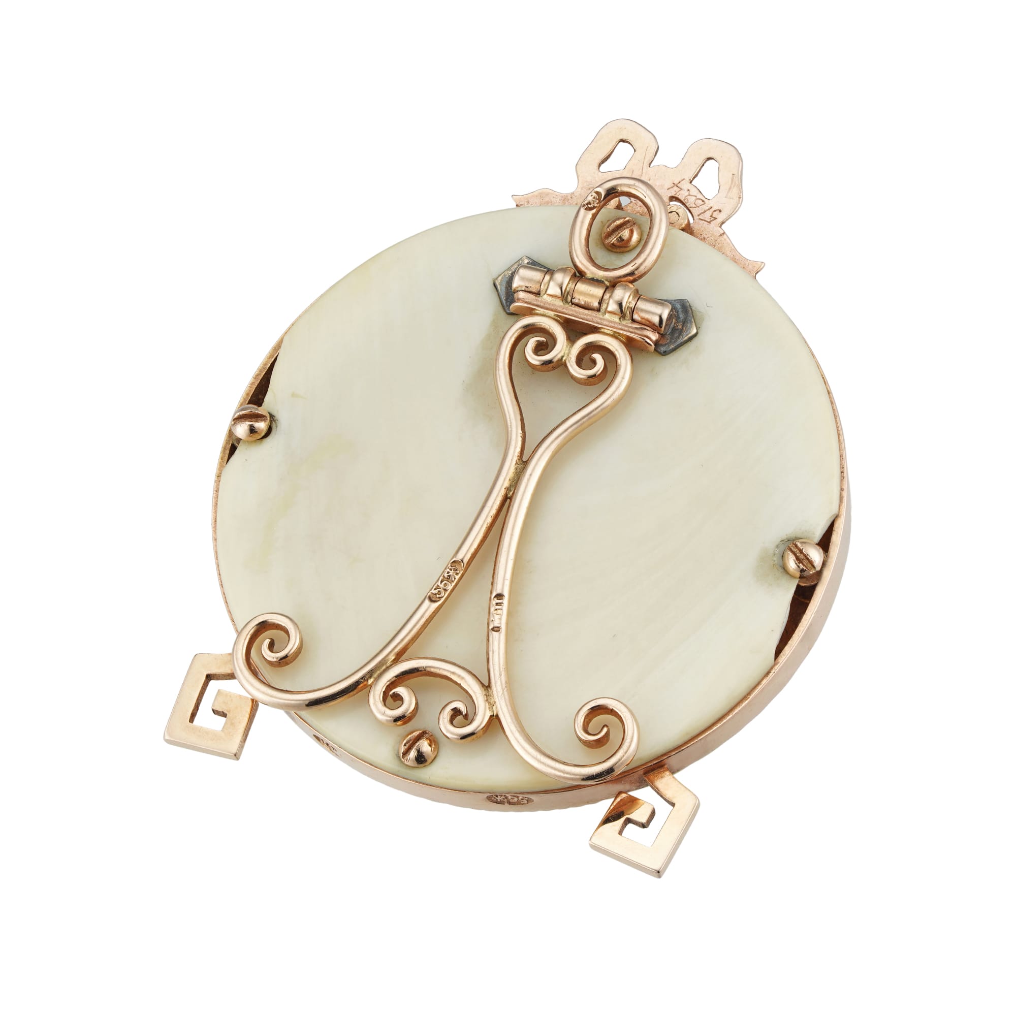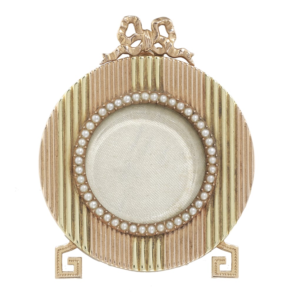 An elegant miniature frame made by Fabergé. Fabergé was established in St Petersburg in 1842, and by the late nineteenth century, was Russia’s largest and best-known jewellery house. The house has become known for their royal commissions and their close ties to the family of Tsar Nicholas II. This lovely frame is circular, featuring reeded stripes of alternating white gold and yellow gold. The gold base surrounds a further circular frame of lustrous pearls, which surround the picture aperture. Atop the frame is an exquisite gold bow, delicately carved. The frame’s feet are stylised in a Greek key motif. This wonderful piece bears the signature of workmaster Michael Perchin who was responsible for the production of many of the Imperial Easter eggs. An exquisite piece.