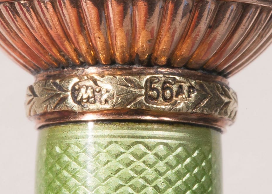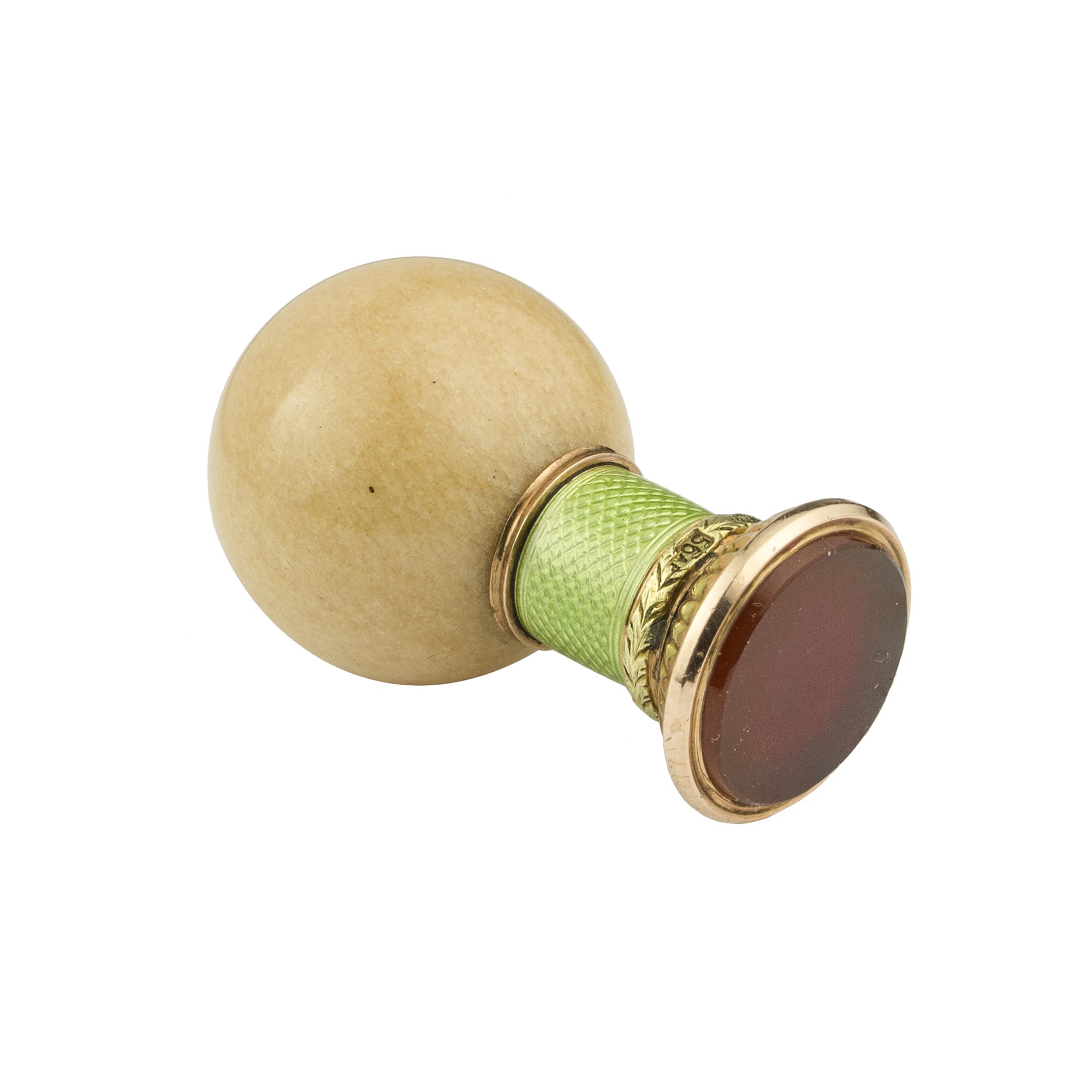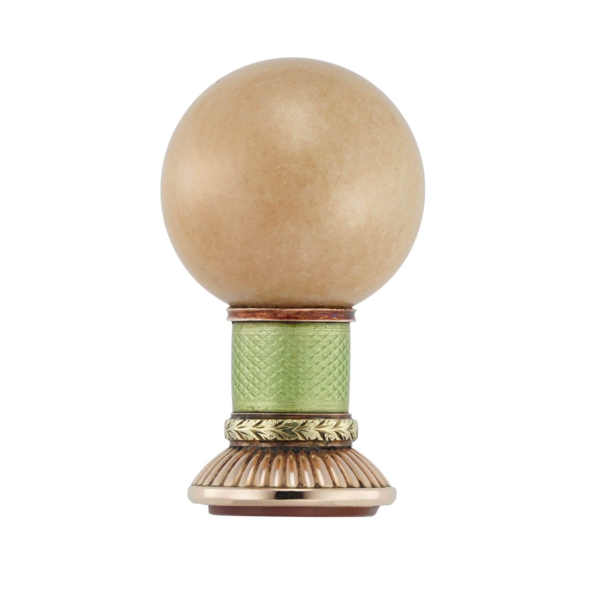 A Fabergé hardstone, gold and enamel desk seal, the spherical handle carved of calcite, resting on a cylinder with apple-green translucent guilloche enamel with diamond pattern engraved background, the base made in rose gold with a yellow gold chased laurel ...