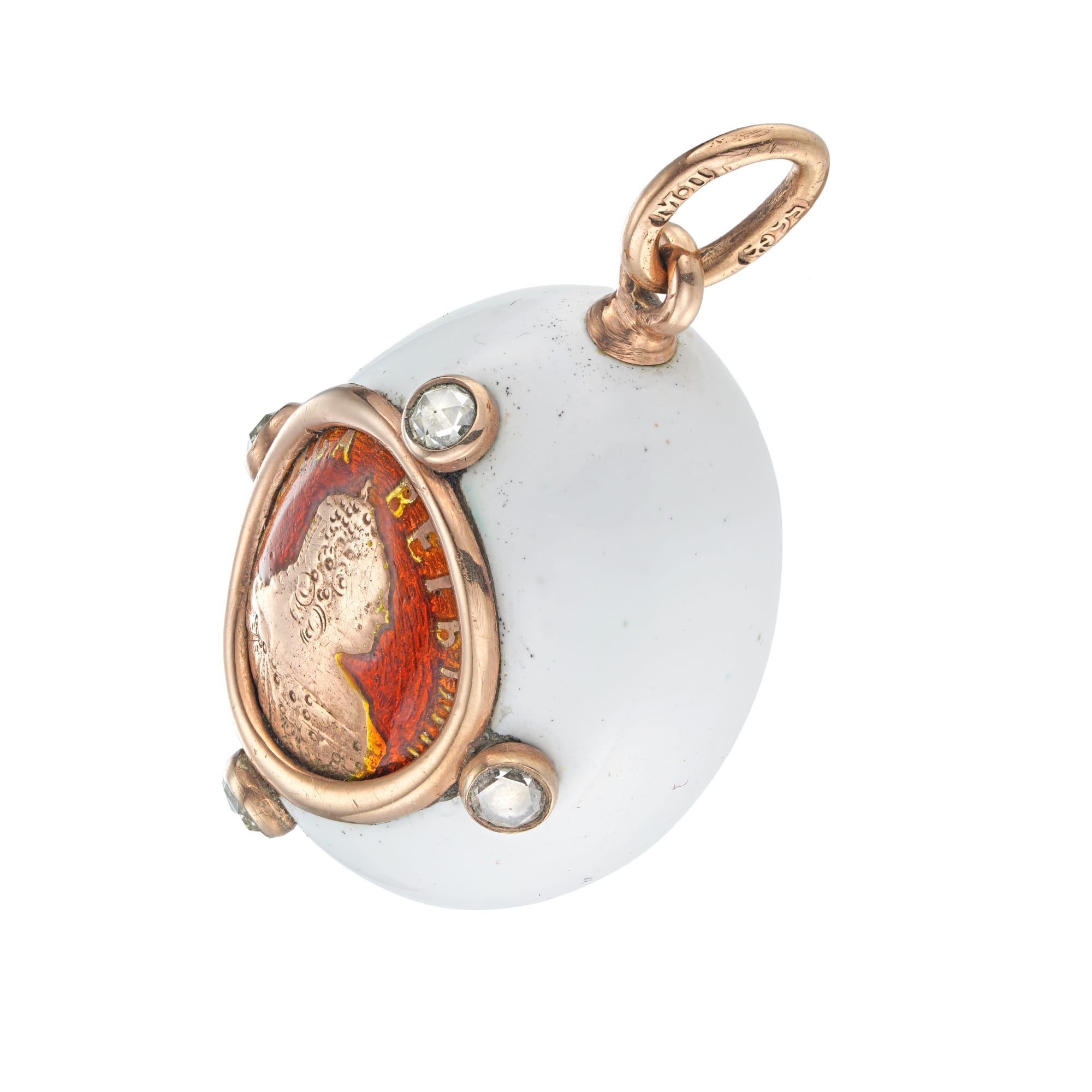 More informationA Fabergé white and red enamelled Easter egg pendant, to the centre a silver-gilt relief of Empress Elizabeth over a red guilloche enamel background, withing a rose gold frame flanked with four rose-cut diamonds, the egg with opaque white enamel and suspended by two gold loops, bearing gold mark for 56 zolotniks and maker’s mark of work-master Mikhail Perkhin, St. Petersburg, circa 1895 – 1898, measuring 2.9 x 1.7cm, gross weight 10 grams.