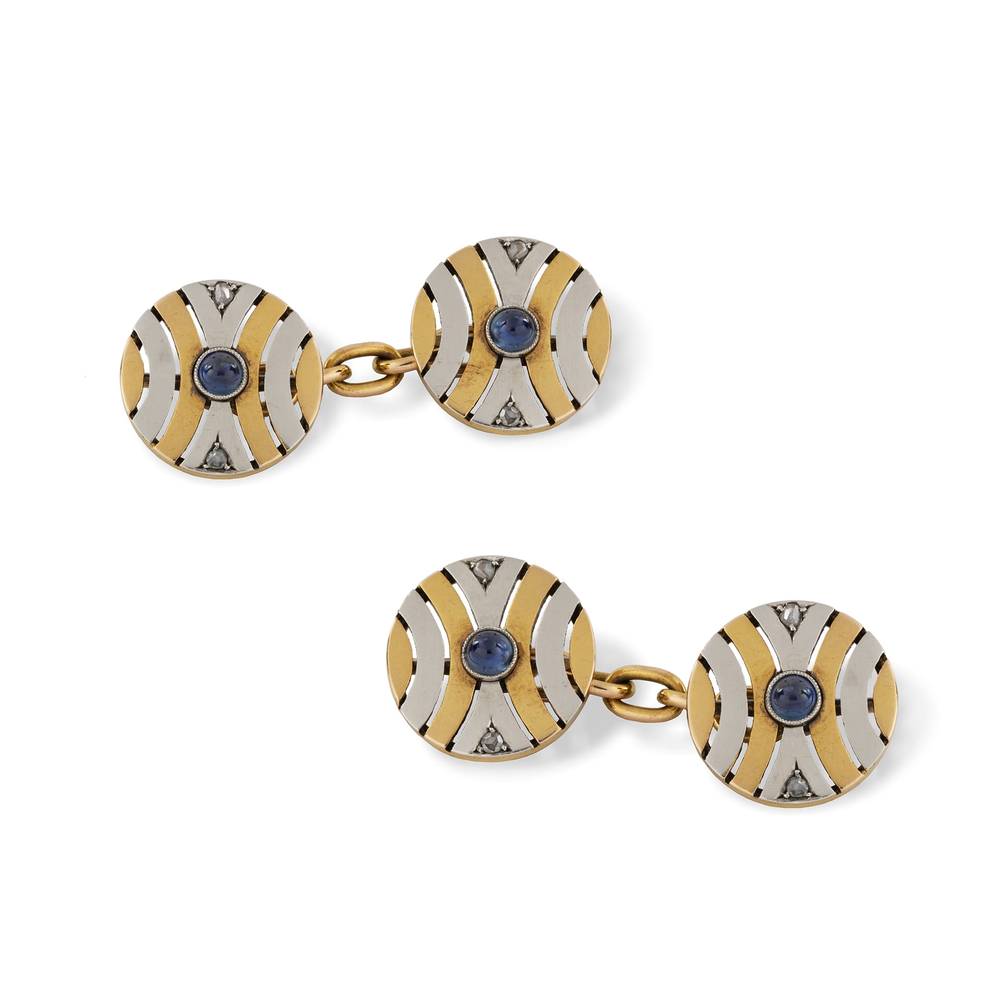 A pair of Art Deco two-colour gold circular cufflinks, each centred with a cabochon sapphire and with two rose cut diamonds, formed as open-work waisted curved sections, marked 18ct gold, circa 1930, measuring approximately 1.3 cm in diameter, gross weight 7.7 grams.